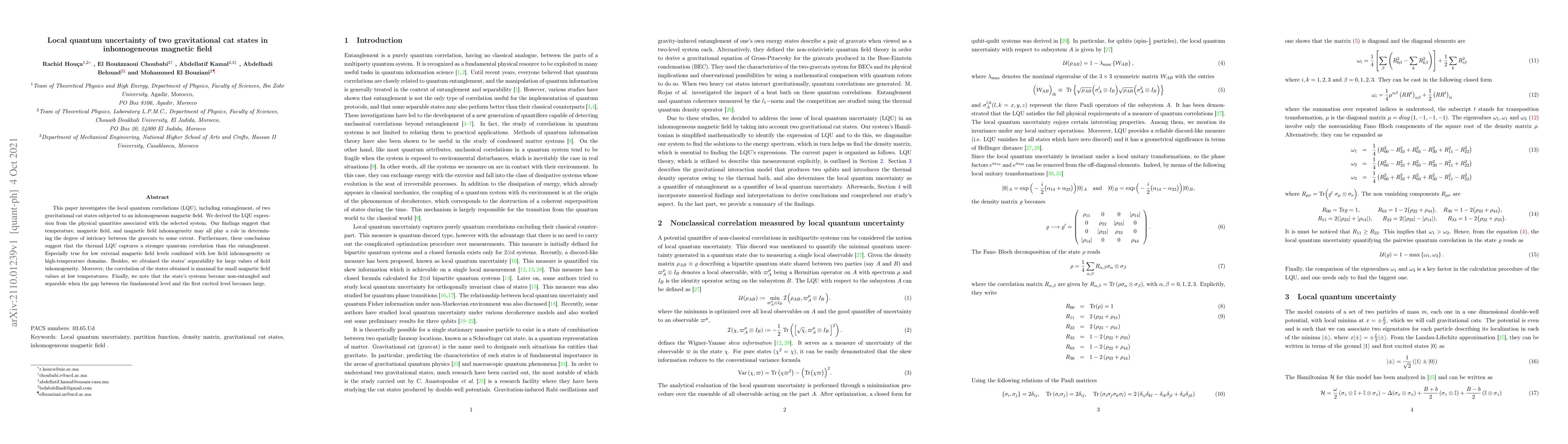 This paper investigates the local quantum correlations (LQU), including entanglement, of two gravitational cat states subjected to an inhomogeneous magnetic field. We derived the LQU expression from the physical quantities associated with the selected system. Our findings suggest that temperature, magnetic field, and magnetic field inhomogeneity may all play a role in determining the degree of intricacy between the gravcats to some extent. Furthermore, these conclusions suggest that the thermal LQU captures a stronger quantum correlation than the entanglement. Especially true for low external magnetic field levels combined with low field inhomogeneity or high-temperature domains. Besides, we obtained the states' separability for large values of field inhomogeneity. Moreover, the correlation of the states obtained is maximal for small magnetic field values at low temperatures. Finally, we note that the state's systems become non-entangled and separable when the gap between the fundamental level and the first excited level becomes large.