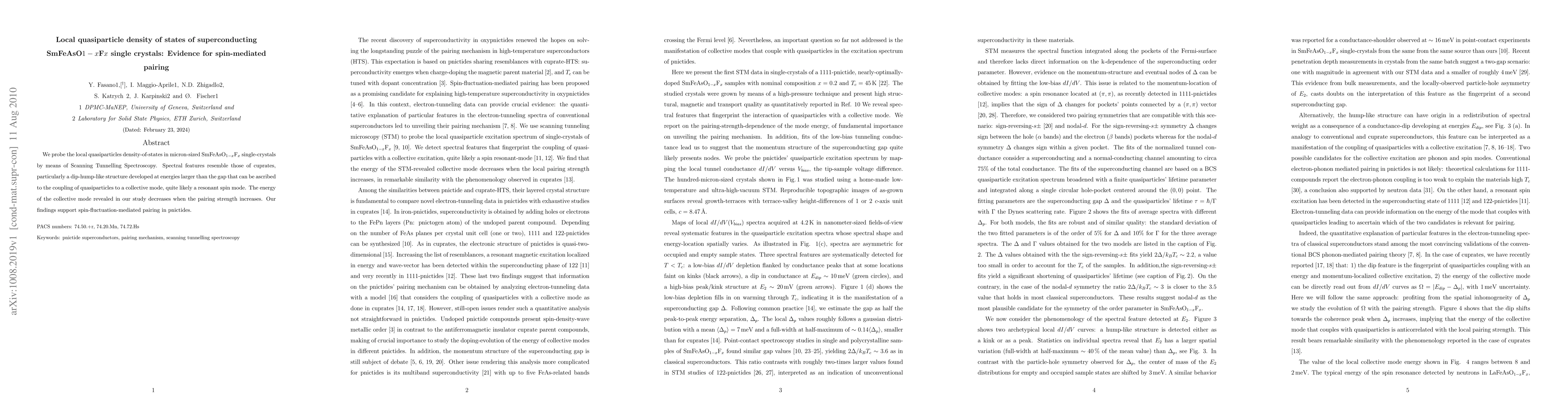 This study uses Scanning Tunnelling Spectroscopy to investigate the local quasiparticle density of states in SmFeAsO$_{1-x}$F$_{x}$ single crystals, revealing a dip-hump-like structure indicative of spin-mediated pairing, similar to cuprates, and supporting spin-fluctuation-mediated pairing in pnictides.