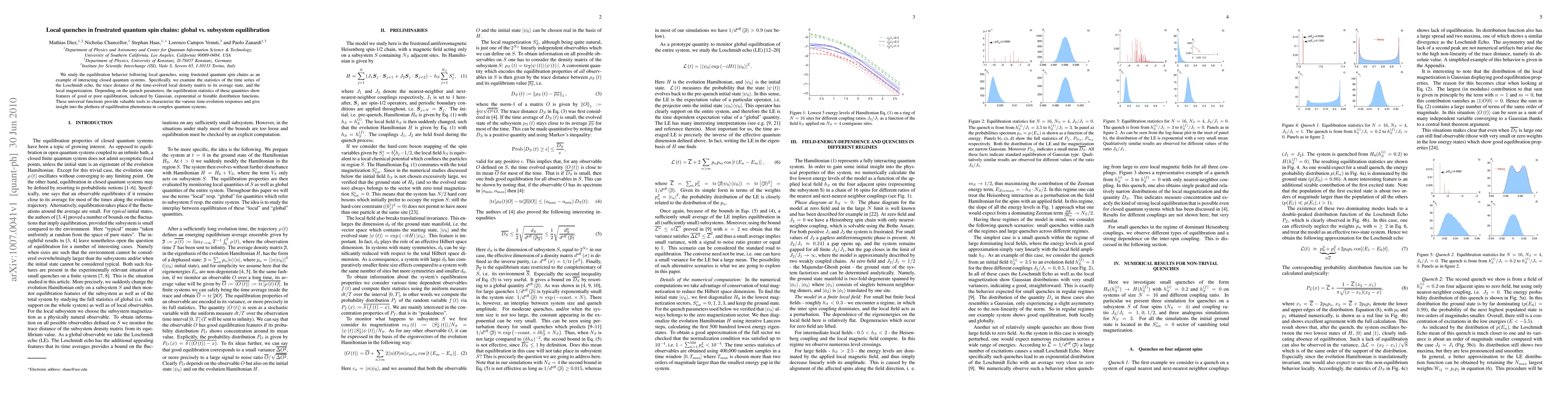 Researchers studied frustrated quantum spin chains after local quenches, finding universal functions for equilibration statistics that provide insight into complex quantum systems. These distributions can indicate good or poor equilibration through Gaussian, exponential, or bistable distribution functions.