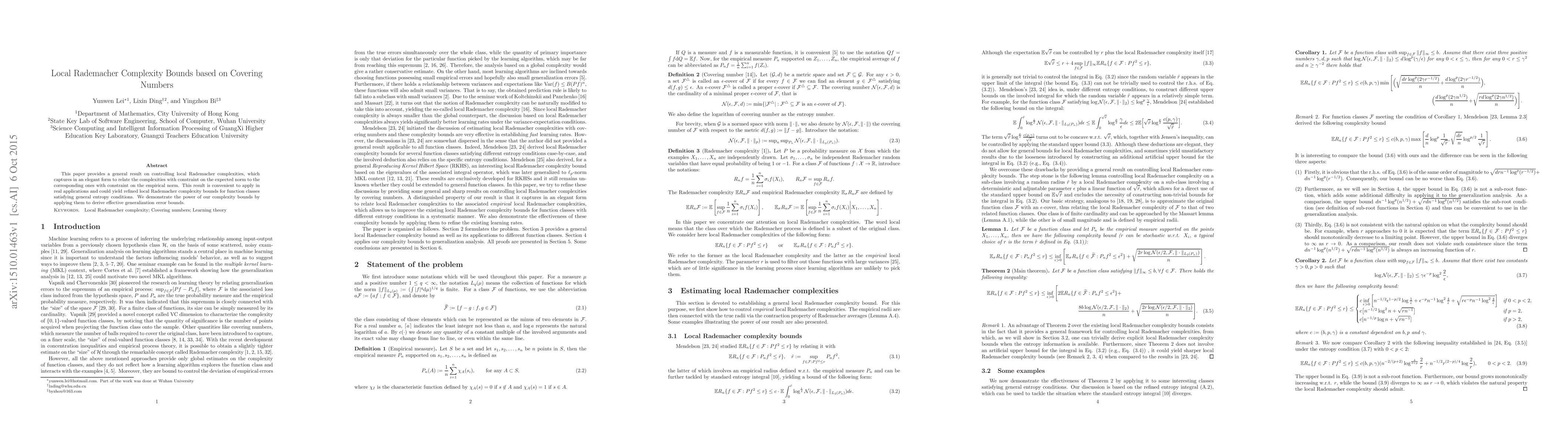 This paper establishes a method to control local Rademacher complexities using covering numbers, offering refined bounds for function classes under general entropy conditions. The derived bounds are effectively applied to achieve improved generalization error estimates.