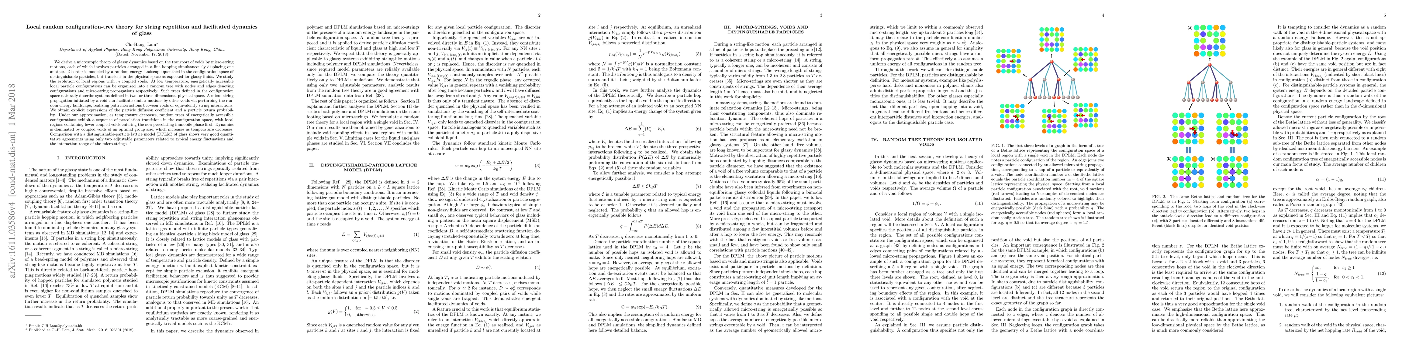 We derive a microscopic theory of glassy dynamics based on the transport of voids by micro-string motions, each of which involves particles arranged in a line hopping simultaneously displacing one another. Disorder is modeled by a random energy landscape quenched in the configuration space of distinguishable particles, but transient in the physical space as expected for glassy fluids. We study the evolution of local regions with m coupled voids. At low temperature, energetically accessible local particle configurations can be organized into a random tree with nodes and edges denoting configurations and micro-string propagations respectively. Such trees defined in the configuration space naturally describe systems defined in two- or three-dimensional physical space. A micro-string propagation initiated by a void can facilitate similar motions by other voids via perturbing the random energy landscape, realizing path interactions between voids or equivalently string interactions. We obtain explicit expressions of the particle diffusion coefficient and a particle return probability. Under our approximation, as temperature decreases, random trees of energetically accessible configurations exhibit a sequence of percolation transitions in the configuration space, with local regions containing fewer coupled voids entering the non-percolating immobile phase first. Dynamics is dominated by coupled voids of an optimal group size, which increases as temperature decreases. Comparison with a distinguishable-particle lattice model (DPLM) of glass shows very good quantitative agreements using only two adjustable parameters related to typical energy fluctuations and the interaction range of the micro-strings.