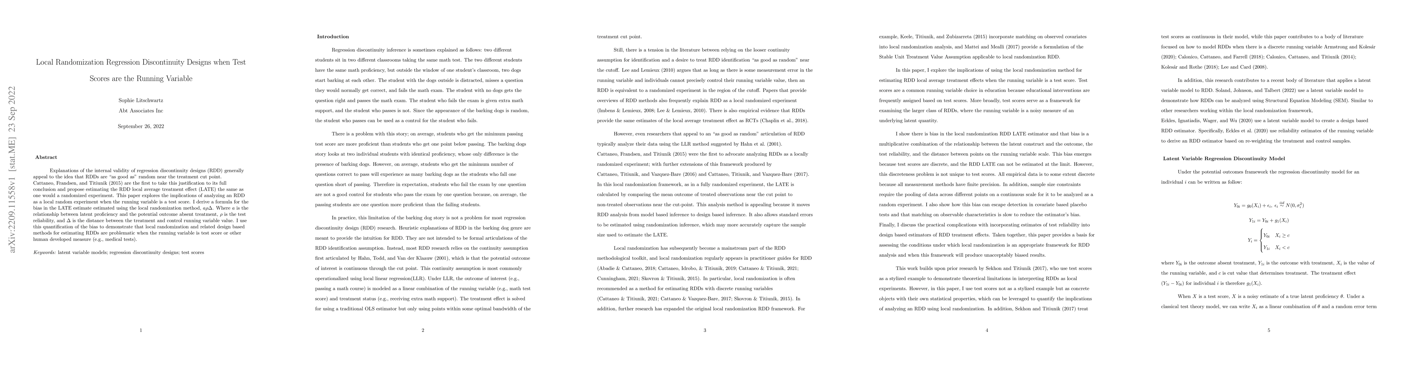 This paper examines the internal validity of Regression Discontinuity Designs (RDD) by proposing a local randomization approach, revealing that the LATE estimate can be biased by $a\rho\Delta$, where $a$ relates to latent proficiency, $\rho$ to test reliability, and $\Delta$ to the distance between treatment and control values. It concludes that local randomization methods are problematic when the running variable is a test score.
