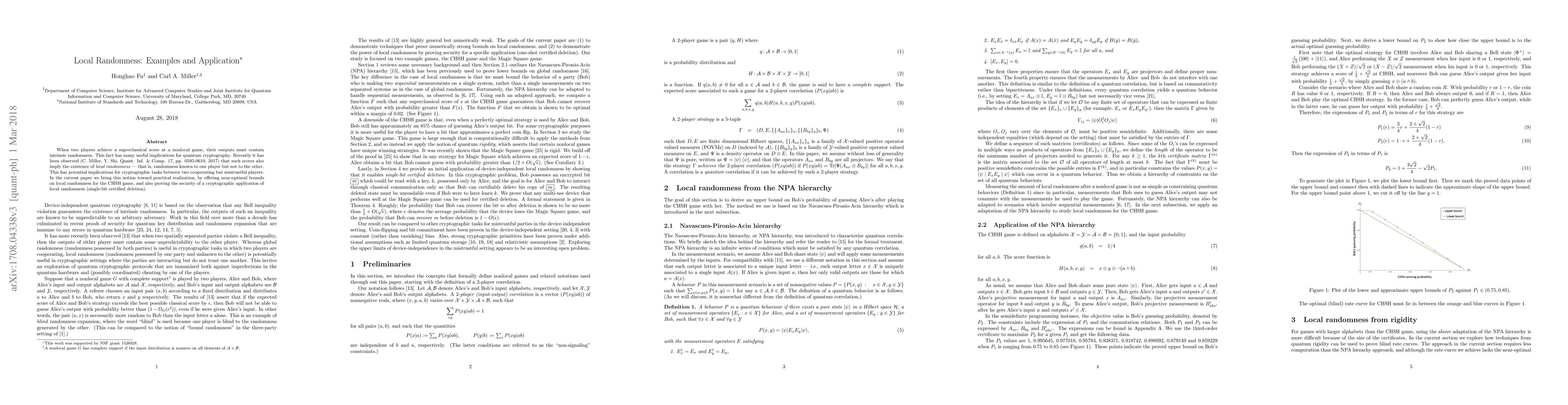 When two players achieve a superclassical score at a nonlocal game, their outputs must contain intrinsic randomness. This fact has many useful implications for quantum cryptography. Recently it has been observed (C. Miller, Y. Shi, Quant. Inf. & Comp. 17, pp. 0595-0610, 2017) that such scores also imply the existence of local randomness -- that is, randomness known to one player but not to the other. This has potential implications for cryptographic tasks between two cooperating but mistrustful players. In the current paper we bring this notion toward practical realization, by offering a near-optimal bound on local randomness for the CHSH game, and also proving the security of a cryptographic application of local randomness (single-bit certified deletion).