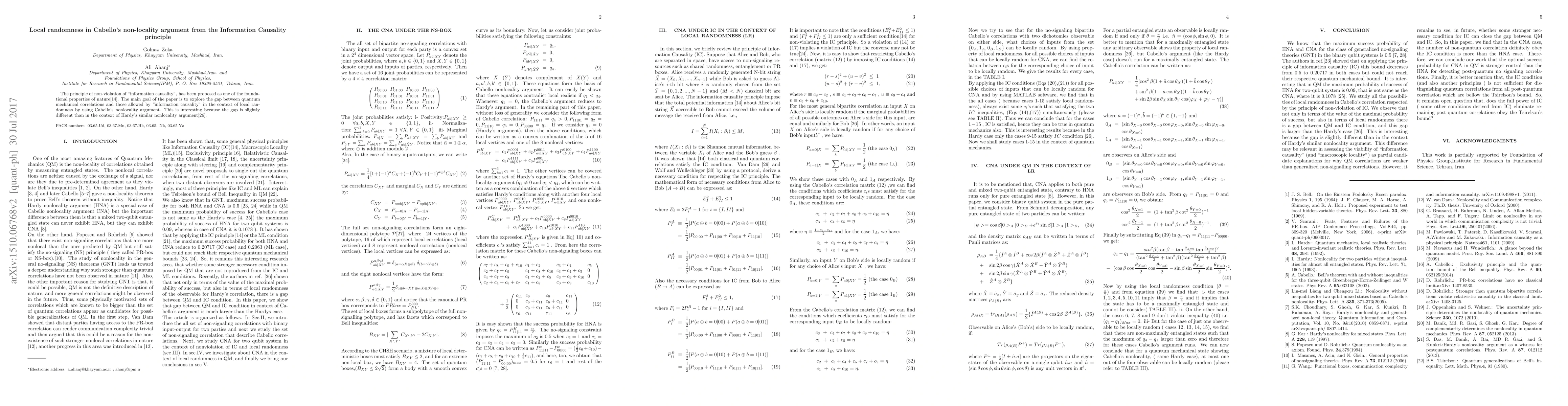 This paper investigates the distinction between quantum mechanical correlations and those permitted by the "information causality" principle, focusing on local randomness through Cabello's nonlocality argument, revealing a unique gap compared to Hardy's similar nonlocality argument.