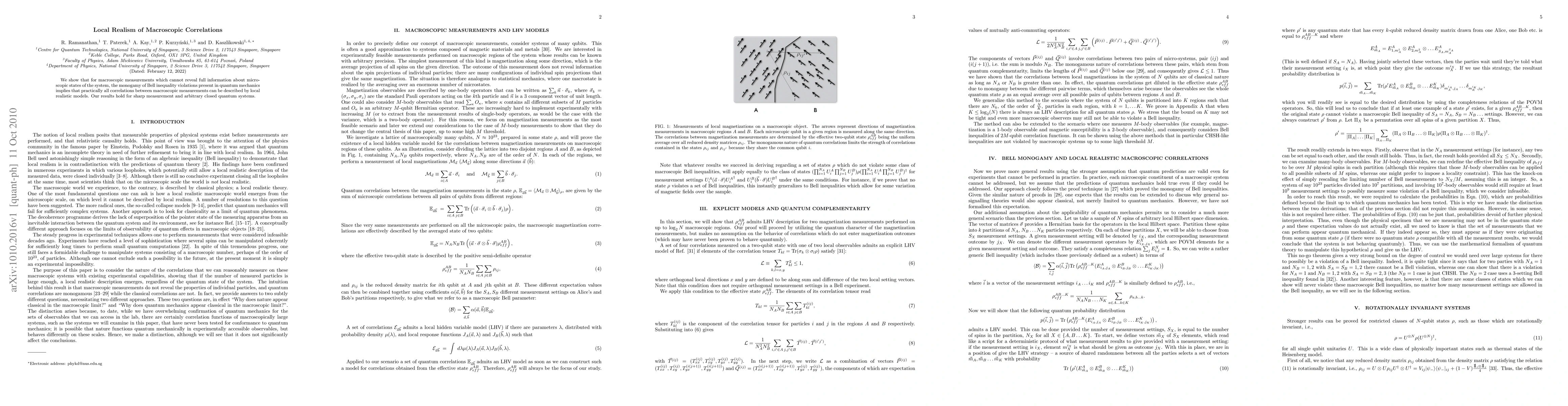 Summary: The paper demonstrates that macroscopic correlations in quantum mechanics can be explained by local realistic models due to the monogamy of Bell inequality violations, even when full microscopic information is inaccessible. This finding applies to both sharp measurements and arbitrary closed quantum systems.