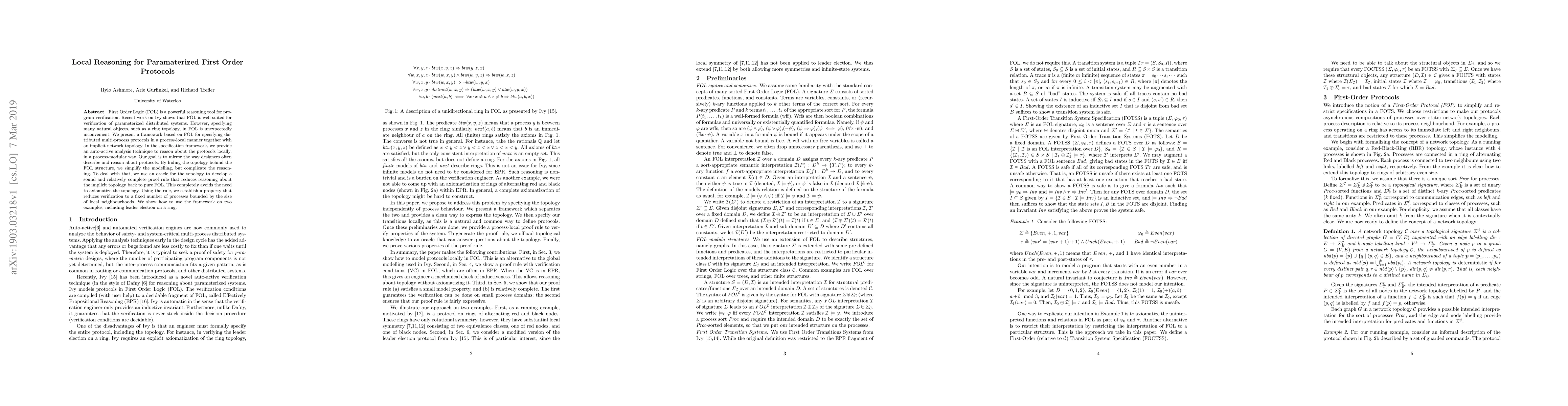 First Order Logic (FOL) is a powerful reasoning tool for program verification. Recent work on Ivy shows that FOL is well suited for verification of parameterized distributed systems. However, specifying many natural objects, such as a ring topology, in FOL is unexpectedly inconvenient. We present a framework based on FOL for specifying distributed multi-process protocols in a process-local manner together with an implicit network topology. In the specification framework, we provide an auto-active analysis technique to reason about the protocols locally, in a process-modular way. Our goal is to mirror the way designers often describe and reason about protocols. By hiding the topology behind the FOL structure, we simplify the modelling, but complicate the reasoning. To deal with that, we use an oracle for the topology to develop a sound and relatively complete proof rule that reduces reasoning about the implicit topology back to pure FOL. This completely avoids the need to axiomatize the topology. Using the rule, we establish a property that reduces verification to a fixed number of processes bounded by the size of local neighbourhoods. We show how to use the framework on two examples, including leader election on a ring.