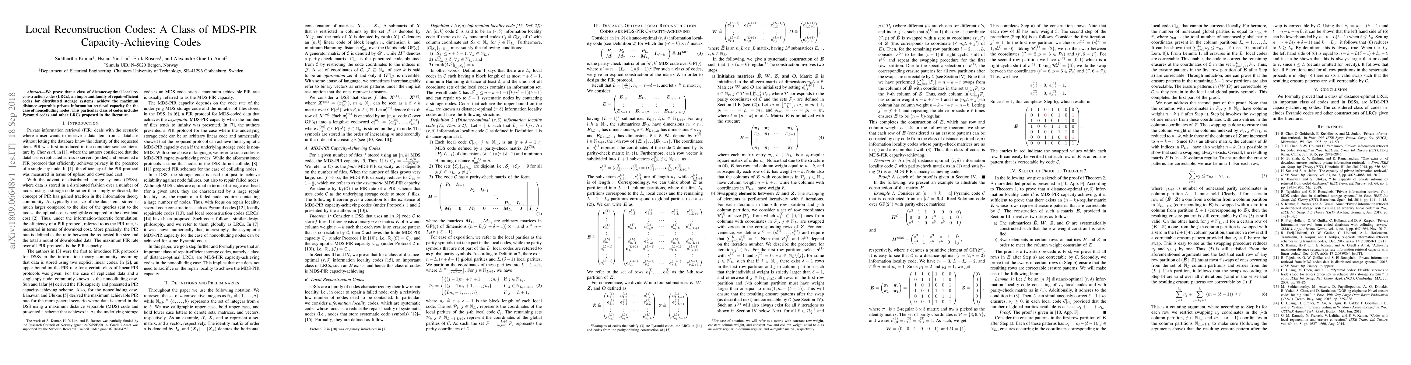 Researchers prove a class of local reconstruction codes achieve maximum capacity for private information retrieval in distributed storage systems. These codes, including Pyramid codes, optimize distance separability for noncolluding nodes.