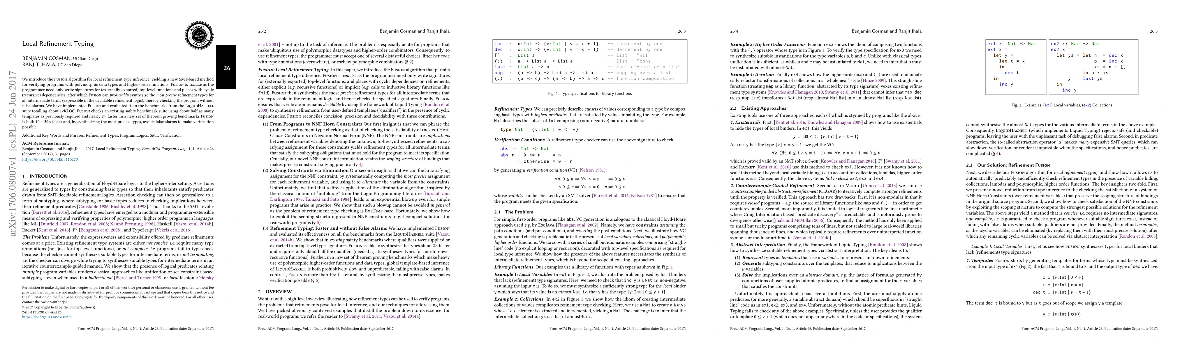 We introduce the Fusion algorithm for local refinement type inference, yielding a new SMT-based method for verifying programs with polymorphic data types and higher-order functions. Fusion is concise as the programmer need only write signatures for (externally exported) top-level functions and places with cyclic (recursive) dependencies, after which Fusion can predictably synthesize the most precise refinement types for all intermediate terms (expressible in the decidable refinement logic), thereby checking the program without false alarms. We have implemented Fusion and evaluated it on the benchmarks from the LiquidHaskell suite totalling about 12KLOC. Fusion checks an existing safety benchmark suite using about half as many templates as previously required and nearly 2x faster. In a new set of theorem proving benchmarks Fusion is both 10 - 50x faster and, by synthesizing the most precise types, avoids false alarms to make verification possible.