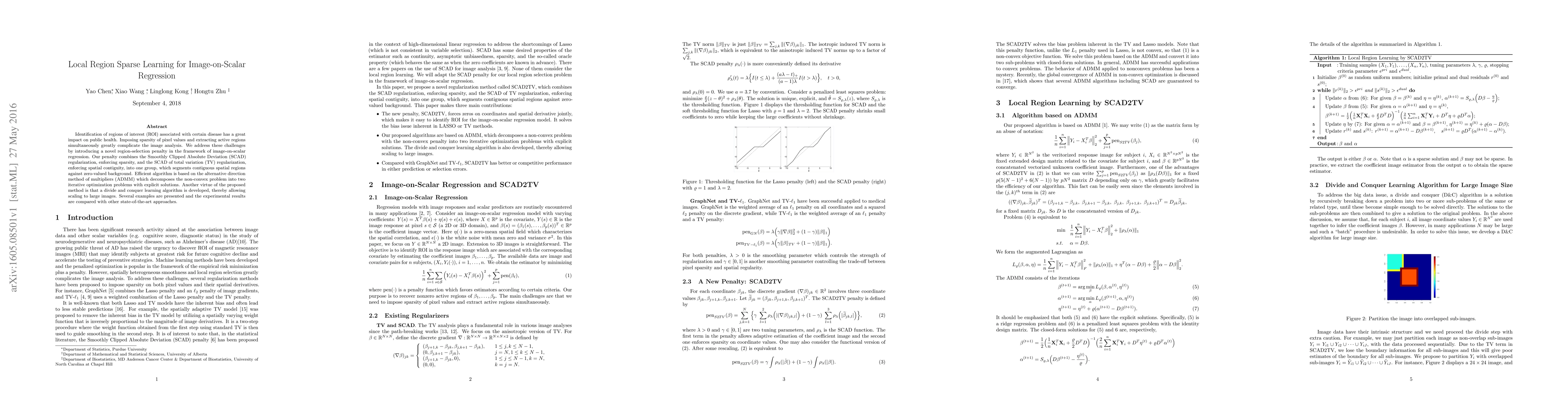 Identification of regions of interest (ROI) associated with certain disease has a great impact on public health. Imposing sparsity of pixel values and extracting active regions simultaneously greatly complicate the image analysis. We address these challenges by introducing a novel region-selection penalty in the framework of image-on-scalar regression. Our penalty combines the Smoothly Clipped Absolute Deviation (SCAD) regularization, enforcing sparsity, and the SCAD of total variation (TV) regularization, enforcing spatial contiguity, into one group, which segments contiguous spatial regions against zero-valued background. Efficient algorithm is based on the alternative direction method of multipliers (ADMM) which decomposes the non-convex problem into two iterative optimization problems with explicit solutions. Another virtue of the proposed method is that a divide and conquer learning algorithm is developed, thereby allowing scaling to large images. Several examples are presented and the experimental results are compared with other state-of-the-art approaches.