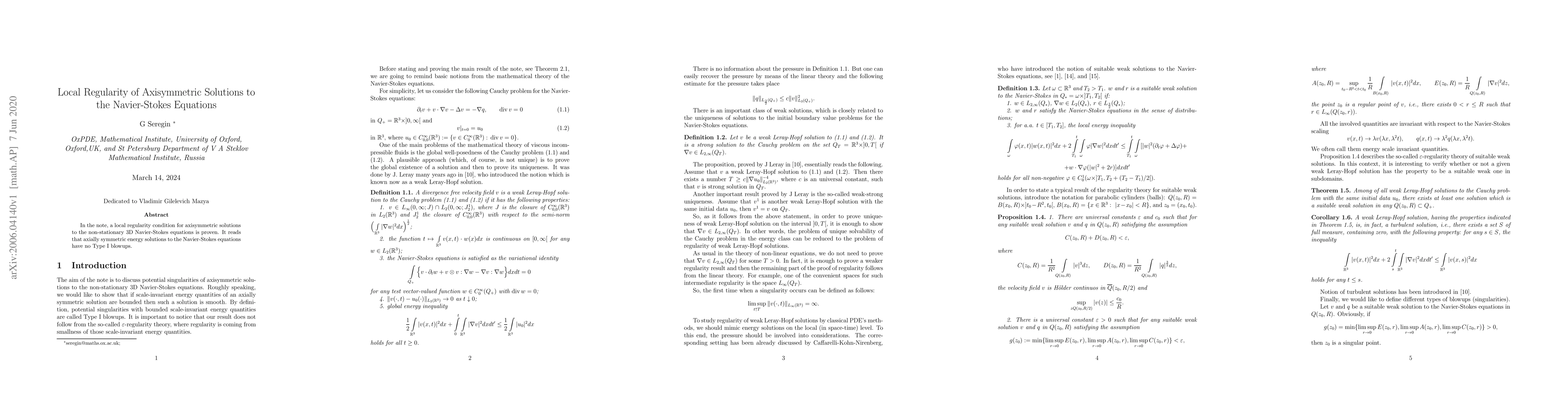 This paper proves a local regularity condition for axisymmetric solutions to the 3D Navier-Stokes equations, demonstrating that such solutions do not experience Type I blowups.