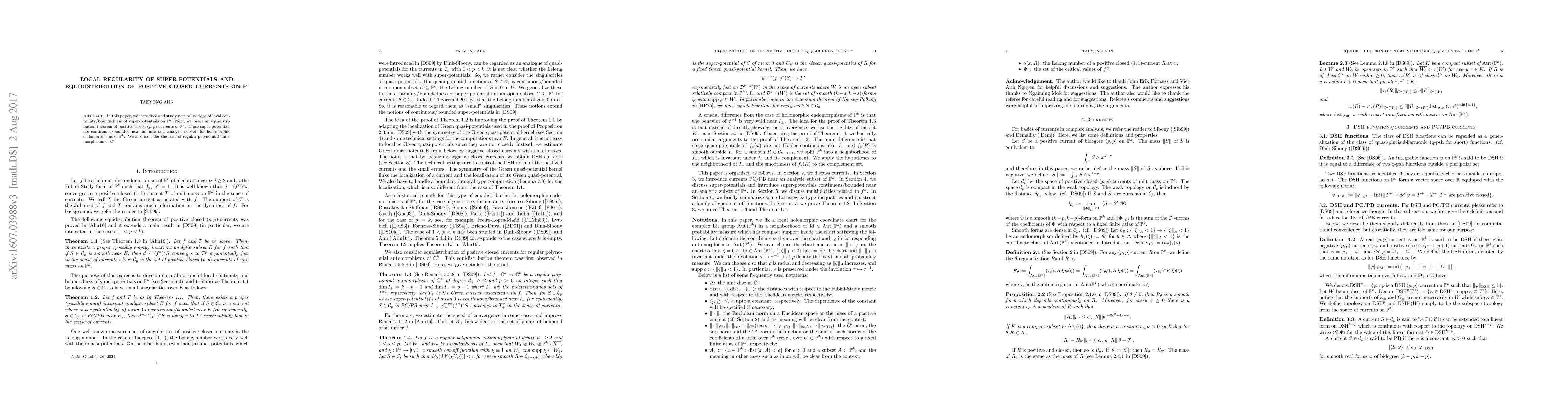 This paper explores the local regularity of super-potentials and demonstrates the equidistribution of positive closed $(p, p)$-currents in $\mathbb{P}^k$ under bounded super-potentials near an invariant analytic subset, applicable to holomorphic endomorphisms and regular polynomial automorphisms.