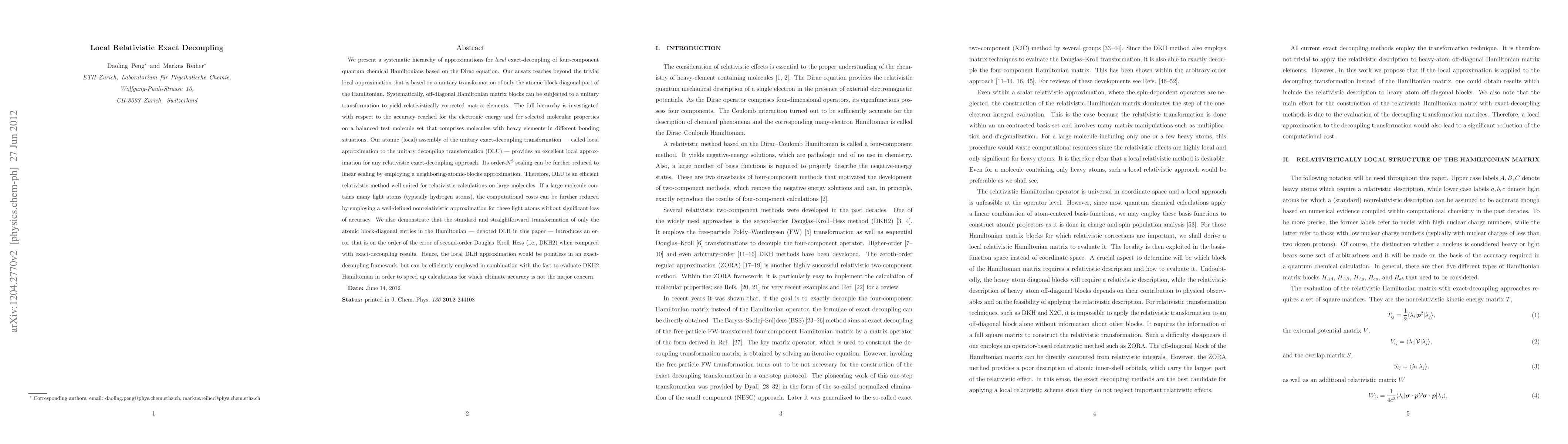 We present a systematic hierarchy of approximations for {\it local} exact-decoupling of four-component quantum chemical Hamiltonians based on the Dirac equation. Our ansatz reaches beyond the trivial local approximation that is based on a unitary transformation of only the atomic block-diagonal part of the Hamiltonian. Systematically, off-diagonal Hamiltonian matrix blocks can be subjected to a unitary transformation to yield relativistically corrected matrix elements. The full hierarchy is investigated with respect to the accuracy reached for the electronic energy and molecular properties on a balanced test molecule set that comprises molecules with heavy elements in different bonding situations. Our atomic (local) assembly of the unitary transformation needed for exact decoupling provides an excellent local approximation for any relativistic exact-decoupling approach. Its order-$N^2$ scaling can be further reduced to linear scaling by employing the neighboring-atomic-blocks approximation. Therefore, it is an efficient relativistic method perfectly well suited for relativistic calculations on large molecules. If a large molecule contains many light atoms (typically hydrogen atoms), the computational costs can be further reduced by employing a well-defined non-relativistic approximation for these light atoms without significant loss of accuracy.