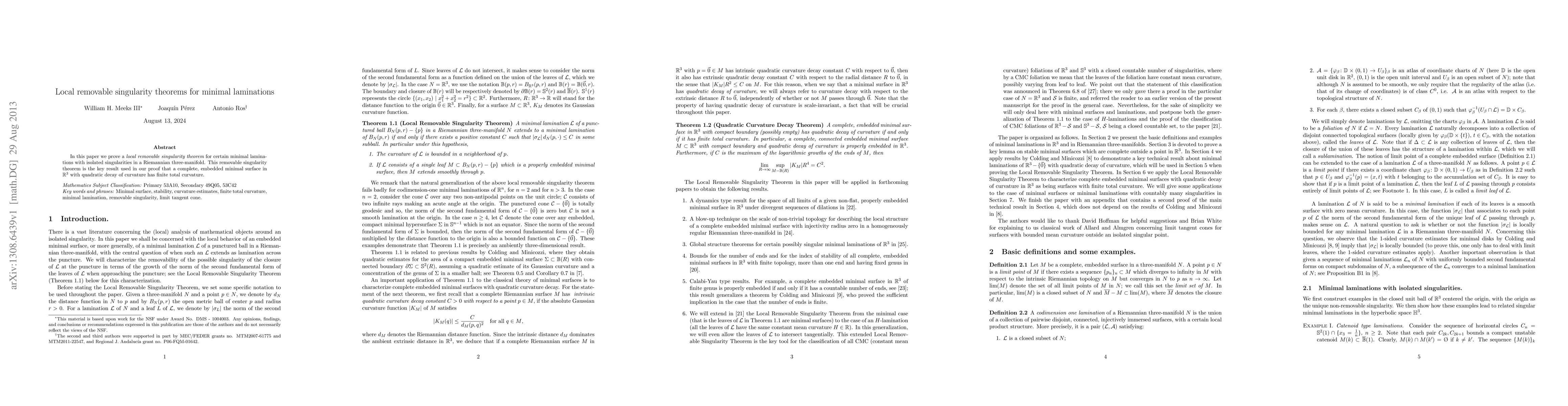 In this paper we prove a local removable singularity theorem for certain minimal laminations with isolated singularities in a Riemannian three-manifold. This removable singularity theorem is the key result used in our proof that a complete, embedded minimal surface in $\mathbb{R}^3$ with quadratic decay of curvature has finite total curvature.