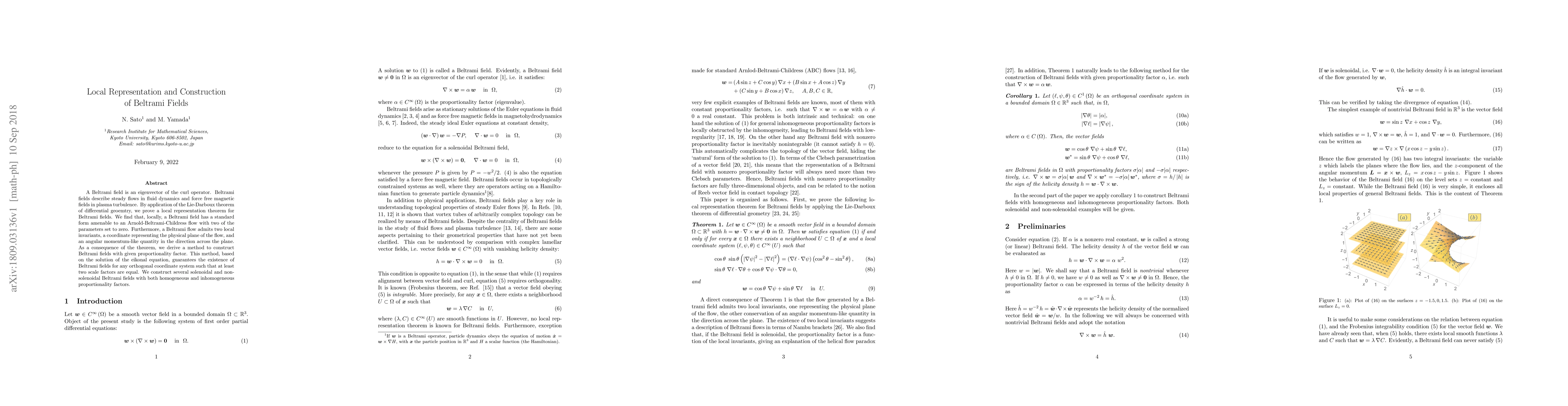 This paper proves a local representation theorem for Beltrami fields using the Lie-Darboux theorem, showing they can be expressed in a standard form. It also derives a method to construct Beltrami fields with specified proportionality factors by solving the eikonal equation, applicable to any orthogonal coordinate system with equal scale factors.
