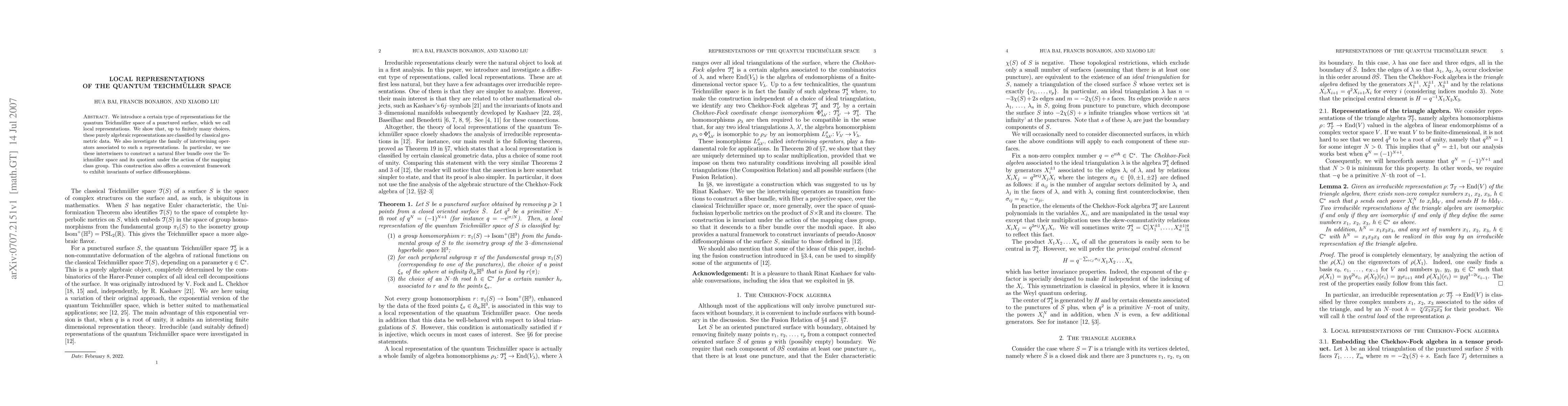 This paper introduces local representations for the quantum Teichmüller space of punctured surfaces, showing they are classified by classical geometric data. It constructs a fiber bundle over the Teichmüller space using intertwiners, providing a framework for surface diffeomorphism invariants.