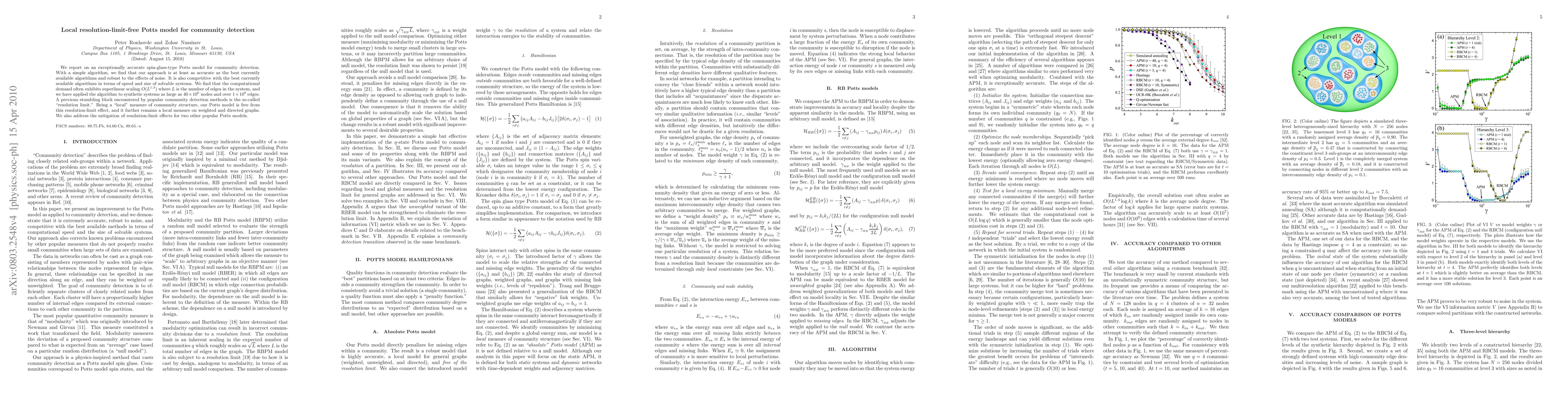 We report on an exceptionally accurate spin-glass-type Potts model for community detection. With a simple algorithm, we find that our approach is at least as accurate as the best currently available algorithms and robust to the effects of noise. It is also competitive with the best currently available algorithms in terms of speed and size of solvable systems. We find that the computational demand often exhibits superlinear scaling L^1.3 where L is the number of edges in the system, and we have applied the algorithm to synthetic systems as large as 40x10^6 nodes and over 1x10^9 edges. A previous stumbling block encountered by popular community detection methods is the so-called "resolution limit." Being a "local" measure of community structure, our Potts model is free from this resolution-limit effect, and it further remains a local measure on weighted and directed graphs. We also address the mitigation of resolution-limit effects for two other popular Potts models.