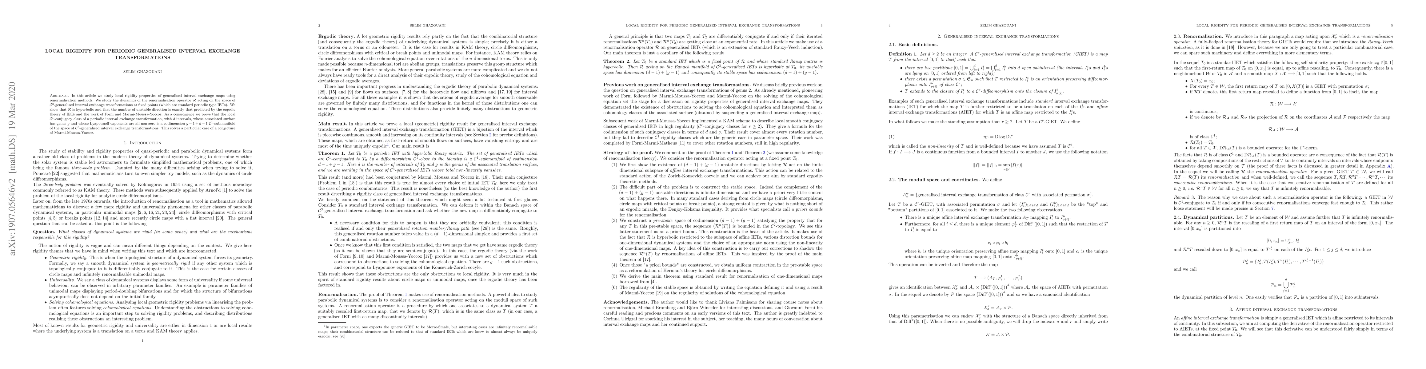 This paper investigates local rigidity properties of $\mathcal{C}^{3}$-generalised interval exchange transformations using renormalisation methods, proving that the renormalisation operator $\mathcal{R}$ is hyperbolic and confirming the predicted number of unstable directions. It concludes that the local $\mathcal{C}^1$-conjugacy class of periodic interval exchange transformations forms a $\mathcal{C}^1$-submanifold of codimension $g-1 +d-1$, solving a specific case of a conjecture by Marmi-Moussa-Yoccoz.