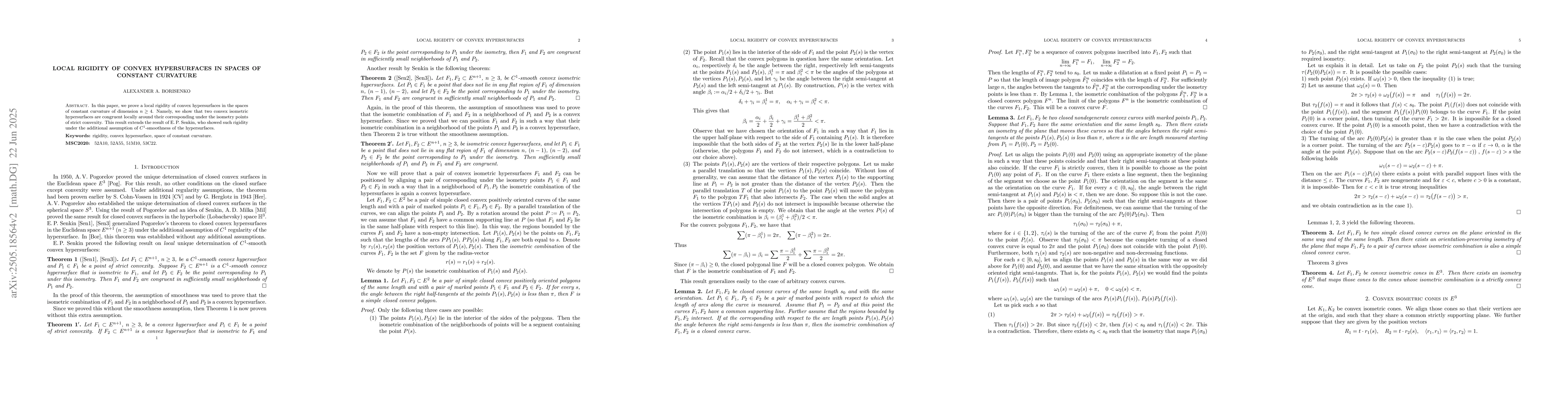 The research methodology involves proving local rigidity of convex hypersurfaces in spaces of constant curvature of dimension $n\geq4$ through isometric comparisons.