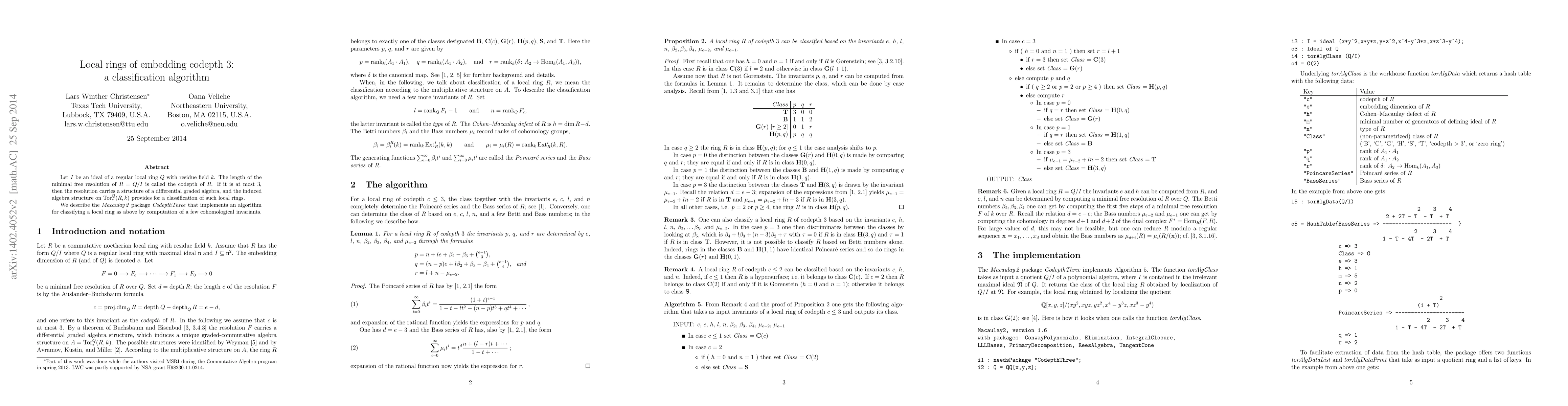 This paper presents a Macaulay2 package, CodepthThree, for classifying local rings with codepth at most 3 by computing specific cohomological invariants. The algorithm leverages the structure of differential graded algebras induced by the minimal free resolution of the quotient ring.