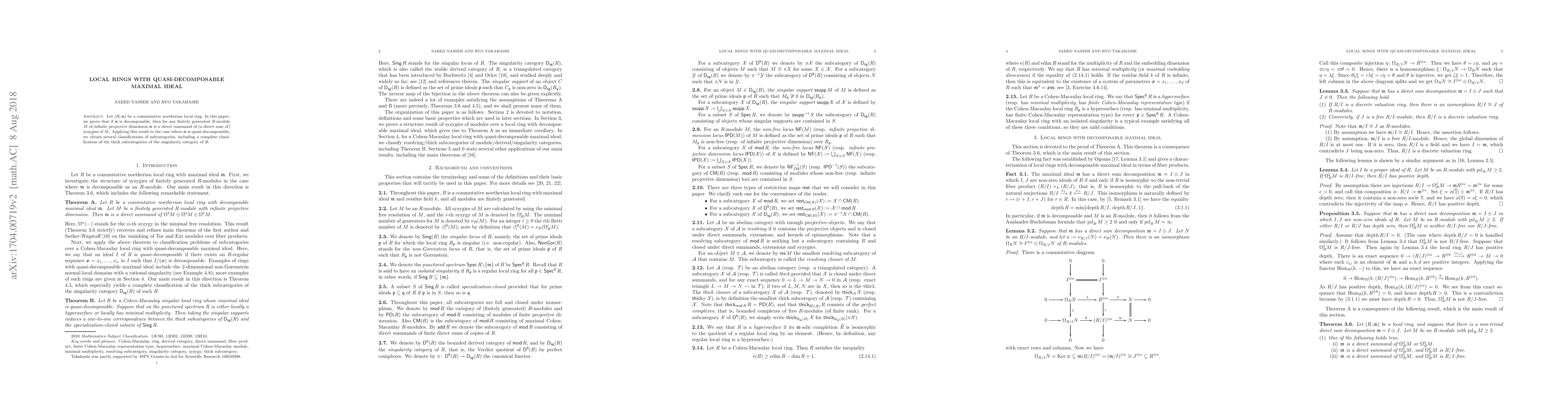 Let $(R,\frak m)$ be a commutative noetherian local ring. In this paper, we prove that if $\frak m$ is decomposable, then for any finitely generated $R$-module $M$ of infinite projective dimension $\frak m$ is a direct summand of (a direct sum of) syzygies of $M$. Applying this result to the case where $\frak m$ is quasi-decomposable, we obtain several classfications of subcategories, including a complete classification of the thick subcategories of the singularity category of $R$.