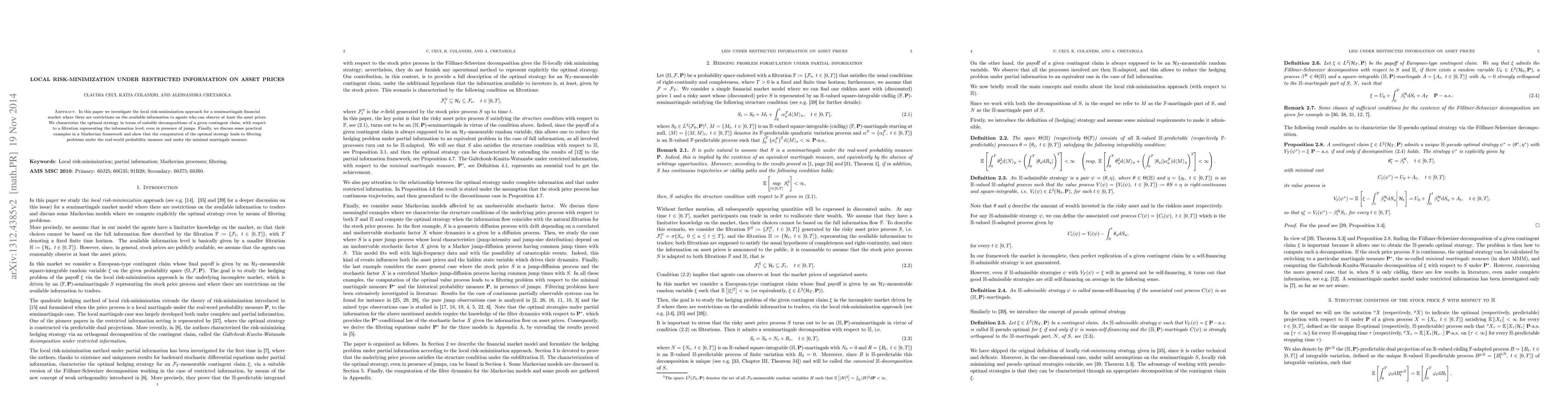 This paper explores local risk-minimization strategies in semimartingale financial markets with restricted information, focusing on agents observing only asset prices. It characterizes optimal strategies through decompositions of contingent claims and discusses practical examples in a Markovian framework, linking computations to filtering problems under real-world and minimal martingale measures.