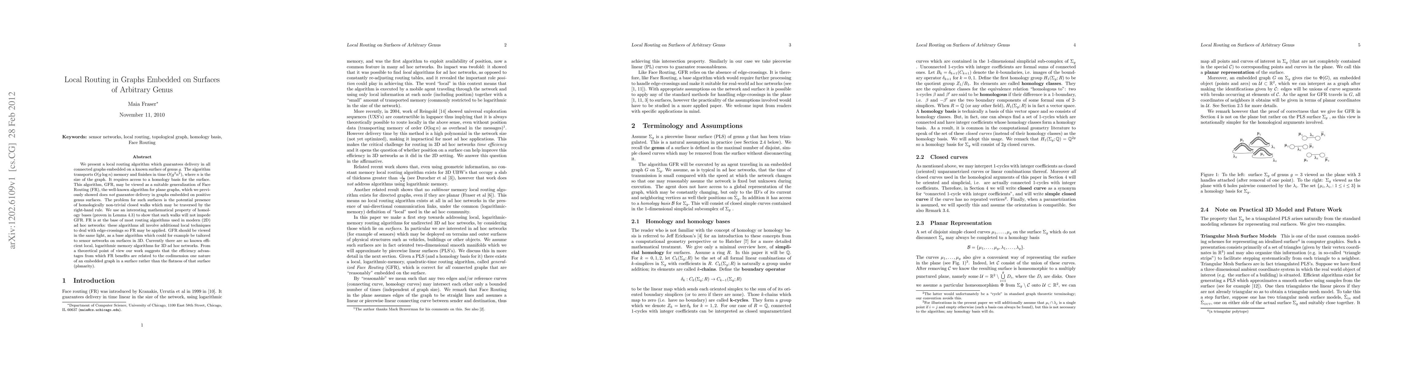We present a local routing algorithm which guarantees delivery in all connected graphs embedded on a known surface of genus $g$. The algorithm transports $O(g\log n)$ memory and finishes in time $O(g^2n^2)$, where $n$ is the size of the graph. It requires access to a homology basis for the surface. This algorithm, GFR, may be viewed as a suitable generalization of Face Routing (FR), the well-known algorithm for plane graphs, which we previously showed does {\it not} guarantee delivery in graphs embedded on positive genus surfaces. The problem for such surfaces is the potential presence of homologically non-trivial closed walks which may be traversed by the right-hand rule. We use an interesting mathematical property of homology bases (proven in Lemma \ref{lem:connectFaceBdr}) to show that such walks will not impede GFR. FR is at the base of most routing algorithms used in modern (2D) ad hoc networks: these algorithms all involve additional local techniques to deal with edge-crossings so FR may be applied. GFR should be viewed in the same light, as a base algorithm which could for example be tailored to sensor networks on surfaces in 3D. Currently there are no known efficient local, logarithmic memory algorithms for 3D ad hoc networks. From a theoretical point of view our work suggests that the efficiency advantages from which FR benefits are related to the codimension one nature of an embedded graph in a surface rather than the flatness of that surface (planarity).