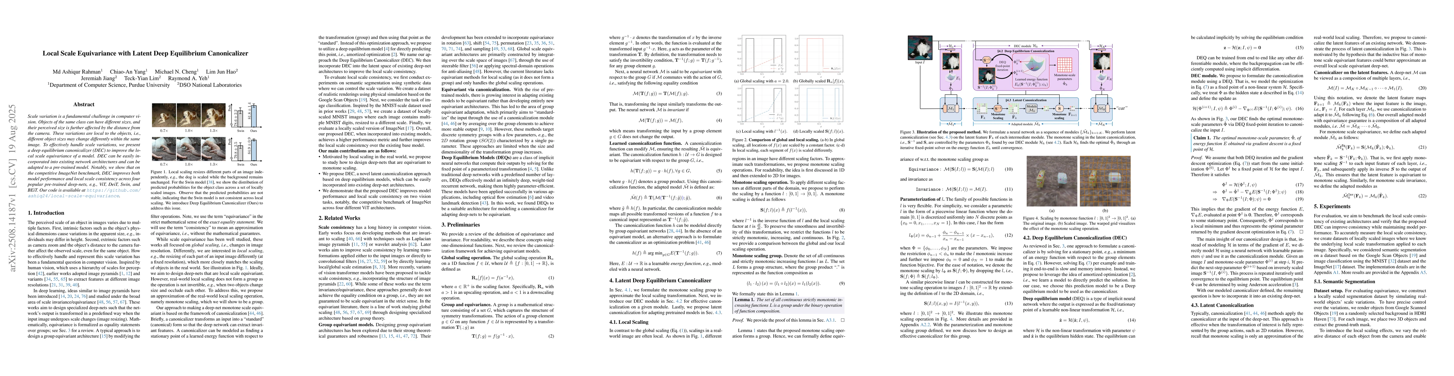 Scale variation is a fundamental challenge in computer vision. Objects of the same class can have different sizes, and their perceived size is further affected by the distance from the camera. These variations are local to the objects, i.e., different object sizes may change differently within the same image. To effectively handle scale variations, we present a deep equilibrium canonicalizer (DEC) to improve the local scale equivariance of a model. DEC can be easily incorporated into existing network architectures and can be adapted to a pre-trained model. Notably, we show that on the competitive ImageNet benchmark, DEC improves both model performance and local scale consistency across four popular pre-trained deep-nets, e.g., ViT, DeiT, Swin, and BEiT. Our code is available at https://github.com/ashiq24/local-scale-equivariance.