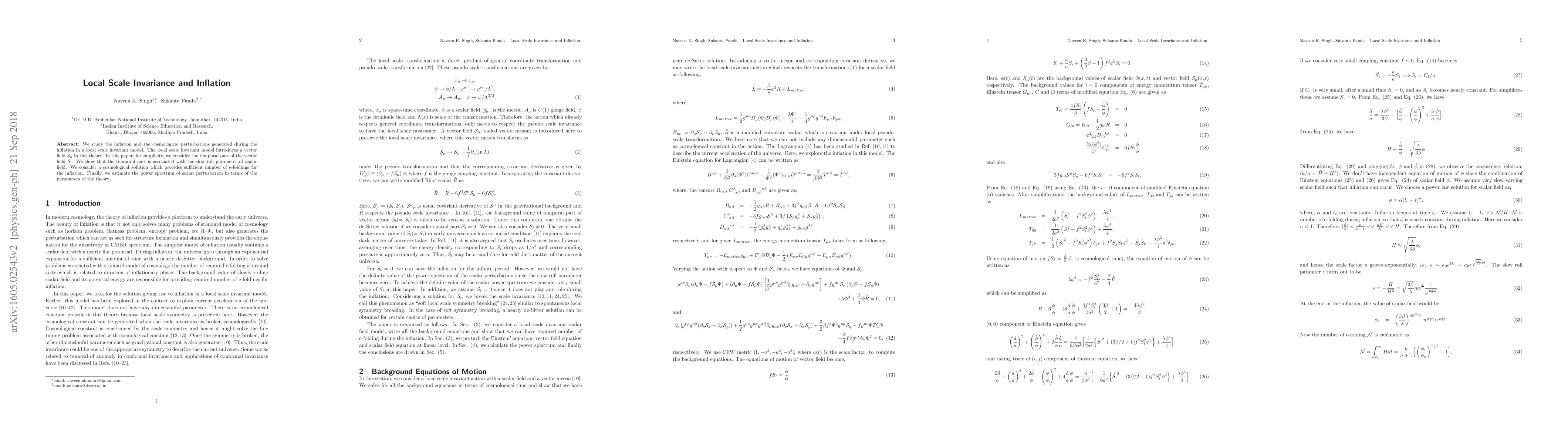 This paper investigates inflation and cosmological perturbations in a local scale invariant model featuring a vector field $S_{\mu}$, focusing on its temporal component $S_t$. It demonstrates that $S_t$ correlates with the scalar field's slow roll parameter, and in a specific gauge, local scale invariance achieves sufficient e-foldings for inflation, while estimating the power spectrum of scalar perturbations.