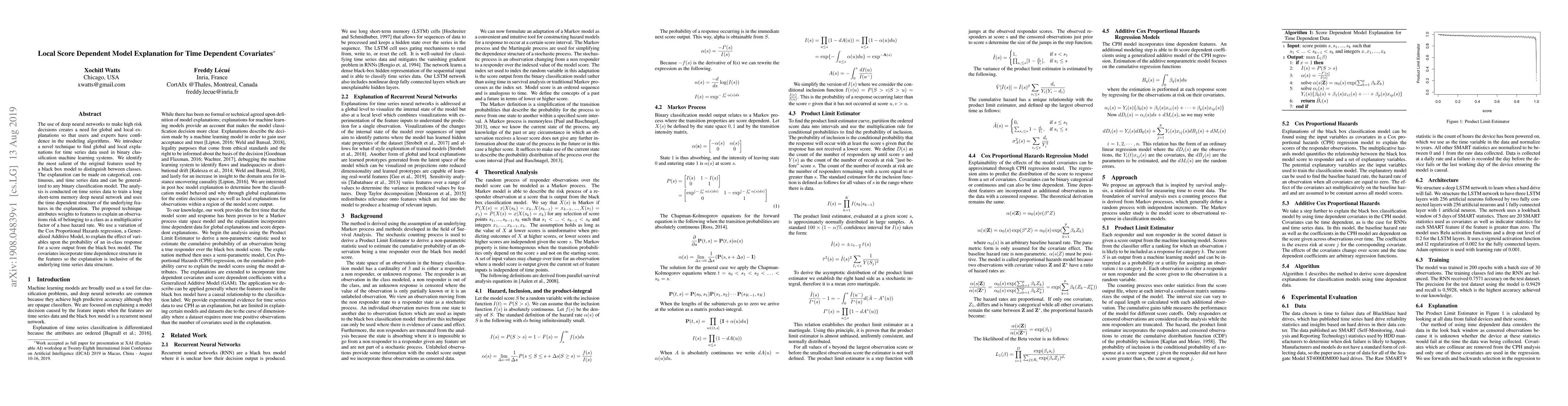 The use of deep neural networks to make high risk decisions creates a need for global and local explanations so that users and experts have confidence in the modeling algorithms. We introduce a novel technique to find global and local explanations for time series data used in binary classification machine learning systems. We identify the most salient of the original features used by a black box model to distinguish between classes. The explanation can be made on categorical, continuous, and time series data and can be generalized to any binary classification model. The analysis is conducted on time series data to train a long short-term memory deep neural network and uses the time dependent structure of the underlying features in the explanation. The proposed technique attributes weights to features to explain an observations risk of belonging to a class as a multiplicative factor of a base hazard rate. We use a variation of the Cox Proportional Hazards regression, a Generalized Additive Model, to explain the effect of variables upon the probability of an in-class response for a score output from the black box model. The covariates incorporate time dependence structure in the features so the explanation is inclusive of the underlying time series data structure.