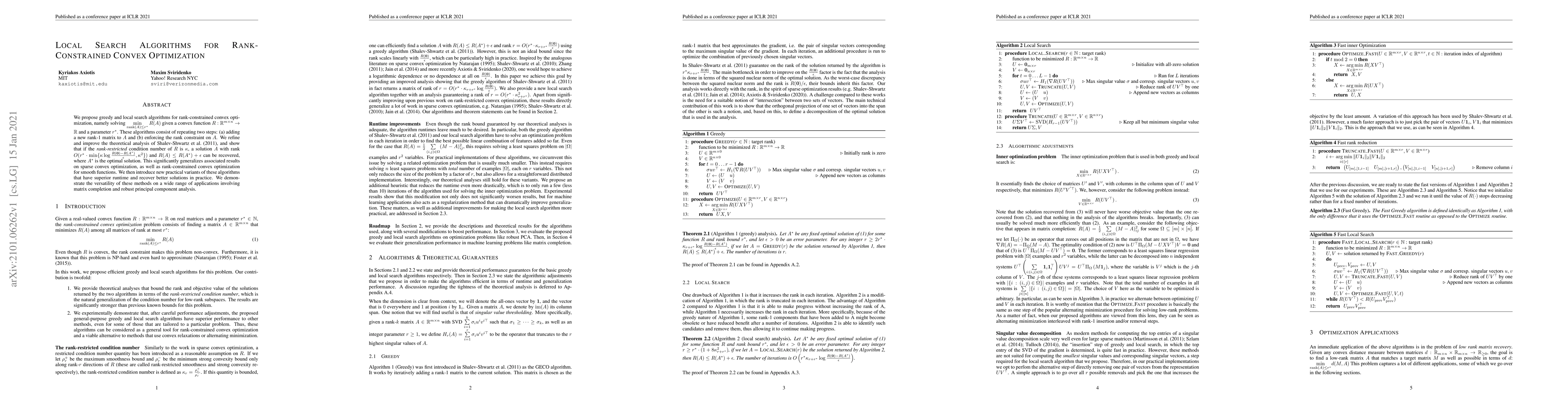 We propose greedy and local search algorithms for rank-constrained convex optimization, namely solving $\underset{\mathrm{rank}(A)\leq r^*}{\min}\, R(A)$ given a convex function $R:\mathbb{R}^{m\times n}\rightarrow \mathbb{R}$ and a parameter $r^*$. These algorithms consist of repeating two steps: (a) adding a new rank-1 matrix to $A$ and (b) enforcing the rank constraint on $A$. We refine and improve the theoretical analysis of Shalev-Shwartz et al. (2011), and show that if the rank-restricted condition number of $R$ is $\kappa$, a solution $A$ with rank $O(r^*\cdot \min\{\kappa \log \frac{R(\mathbf{0})-R(A^*)}{\epsilon}, \kappa^2\})$ and $R(A) \leq R(A^*) + \epsilon$ can be recovered, where $A^*$ is the optimal solution. This significantly generalizes associated results on sparse convex optimization, as well as rank-constrained convex optimization for smooth functions. We then introduce new practical variants of these algorithms that have superior runtime and recover better solutions in practice. We demonstrate the versatility of these methods on a wide range of applications involving matrix completion and robust principal component analysis.
