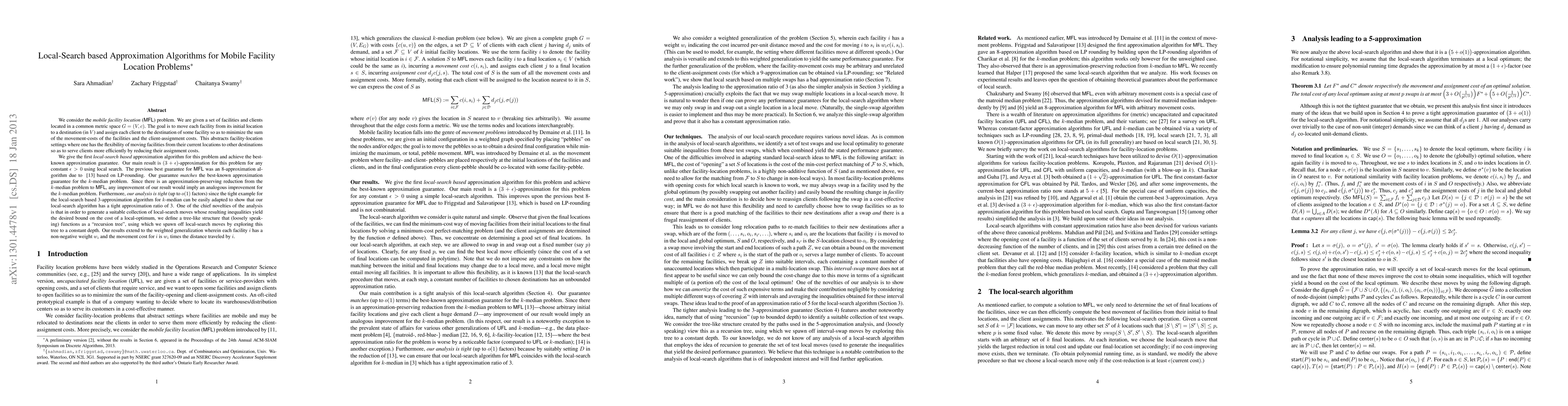 We consider the {\em mobile facility location} (\mfl) problem. We are given a set of facilities and clients located in a common metric space. The goal is to move each facility from its initial location to a destination and assign each client to the destination of some facility so as to minimize the sum of the movement-costs of the facilities and the client-assignment costs. This abstracts facility-location settings where one has the flexibility of moving facilities from their current locations to other destinations so as to serve clients more efficiently by reducing their assignment costs. We give the first {\em local-search based} approximation algorithm for this problem and achieve the best-known approximation guarantee. Our main result is $(3+\epsilon)$-approximation for this problem for any constant $\epsilon>0$ using local search. The previous best guarantee was an 8-approximation algorithm based on LP-rounding. Our guarantee {\em matches} the best-known approximation guarantee for the $k$-median problem. Since there is an approximation-preserving reduction from the $k$-median problem to \mfl, any improvement of our result would imply an analogous improvement for the $k$-median problem. Furthermore, {\em our analysis is tight} (up to $o(1)$ factors) since the tight example for the local-search based 3-approximation algorithm for $k$-median can be easily adapted to show that our local-search algorithm has a tight approximation ratio of 3. One of the chief novelties of the analysis is that in order to generate a suitable collection of local-search moves whose resulting inequalities yield the desired bound on the cost of a local-optimum, we define a tree-like structure that (loosely speaking) functions as a "recursion tree", using which we spawn off local-search moves by exploring this tree to a constant depth.