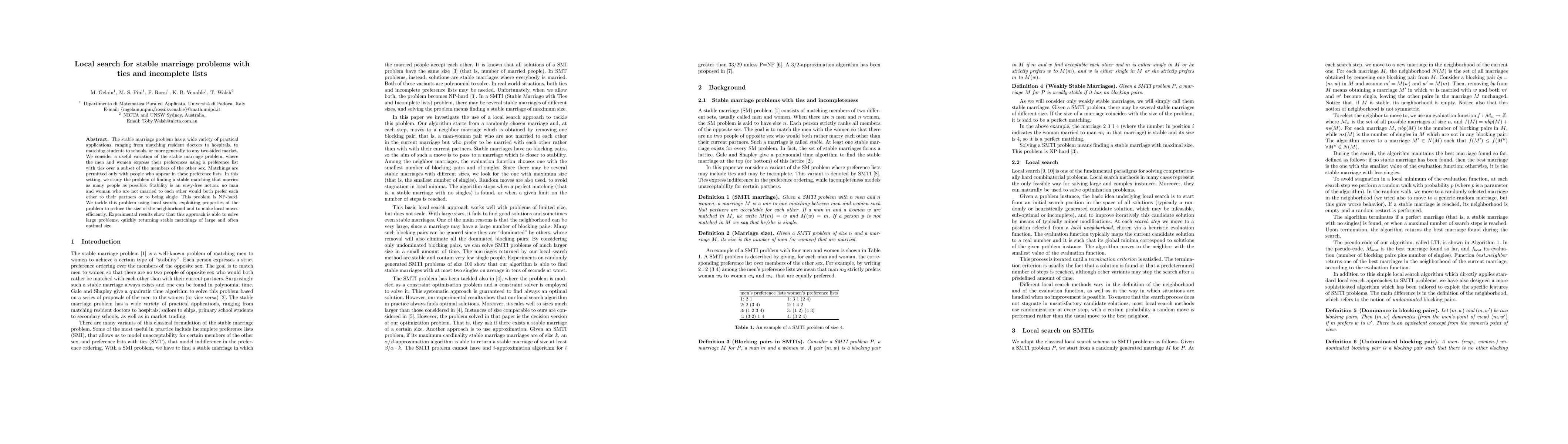 This paper explores a variation of the stable marriage problem where preferences are expressed with ties and incomplete lists, focusing on finding stable matchings that maximize participation. The authors employ local search techniques to efficiently navigate the problem space, demonstrating effective solutions for large instances.