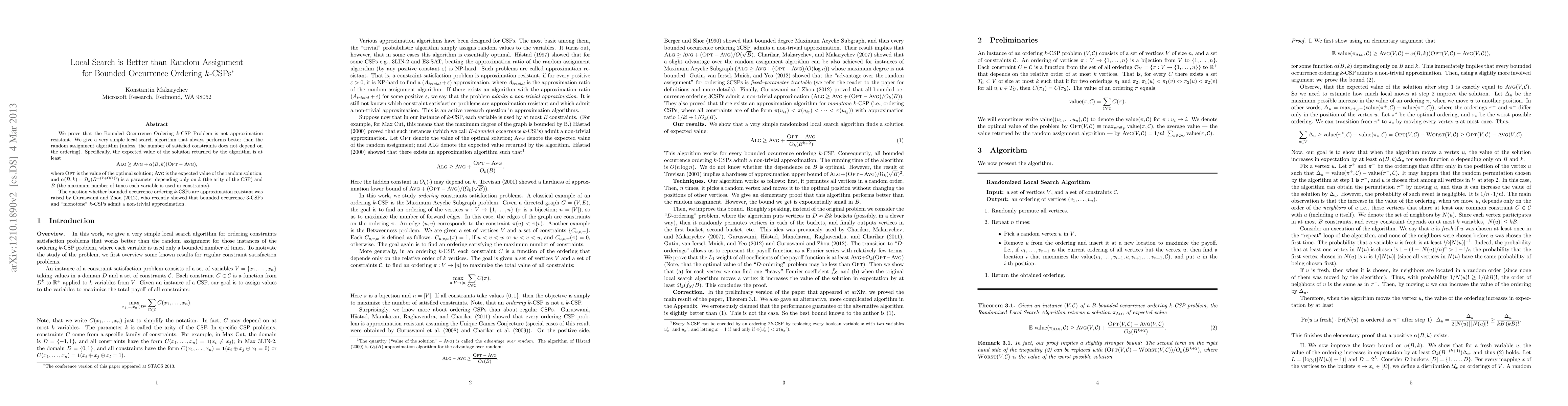 This paper demonstrates that local search algorithms outperform random assignment for solving Bounded Occurrence Ordering k-CSPs, proving the problem is not approximation resistant. The local search algorithm guarantees a solution value significantly better than random assignment, quantified by a parameter dependent on the CSP's arity and maximum variable usage.