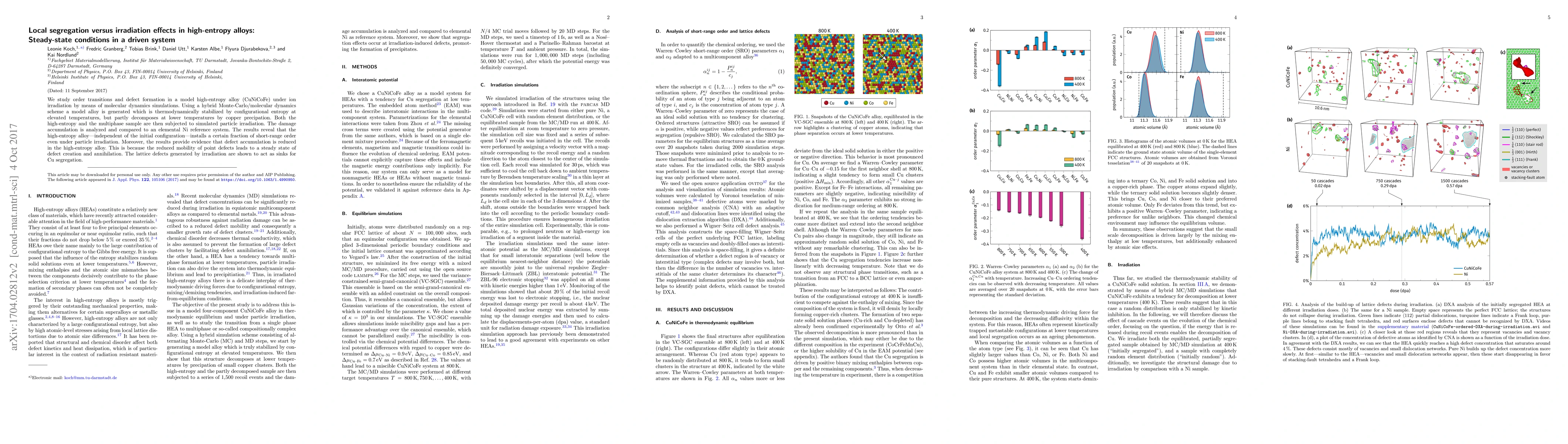 We study order transitions and defect formation in a model high-entropy alloy (CuNiCoFe) under ion irradiation by means of molecular dynamics simulations. Using a hybrid Monte-Carlo/molecular dynamics scheme a model alloy is generated which is thermodynamically stabilized by configurational entropy at elevated temperatures, but partly decomposes at lower temperatures by copper precipation. Both the high-entropy and the multiphase sample are then subjected to simulated particle irradiation. The damage accumulation is analyzed and compared to an elemental Ni reference system. The results reveal that the high-entropy alloy---independent of the initial configuration---installs a certain fraction of short-range order even under particle irradiation. Moreover, the results provide evidence that defect accumulation is reduced in the high-entropy alloy. This is because the reduced mobility of point defects leads to a steady state of defect creation and annihilation. The lattice defects generated by irradiation are shown to act as sinks for Cu segregation.