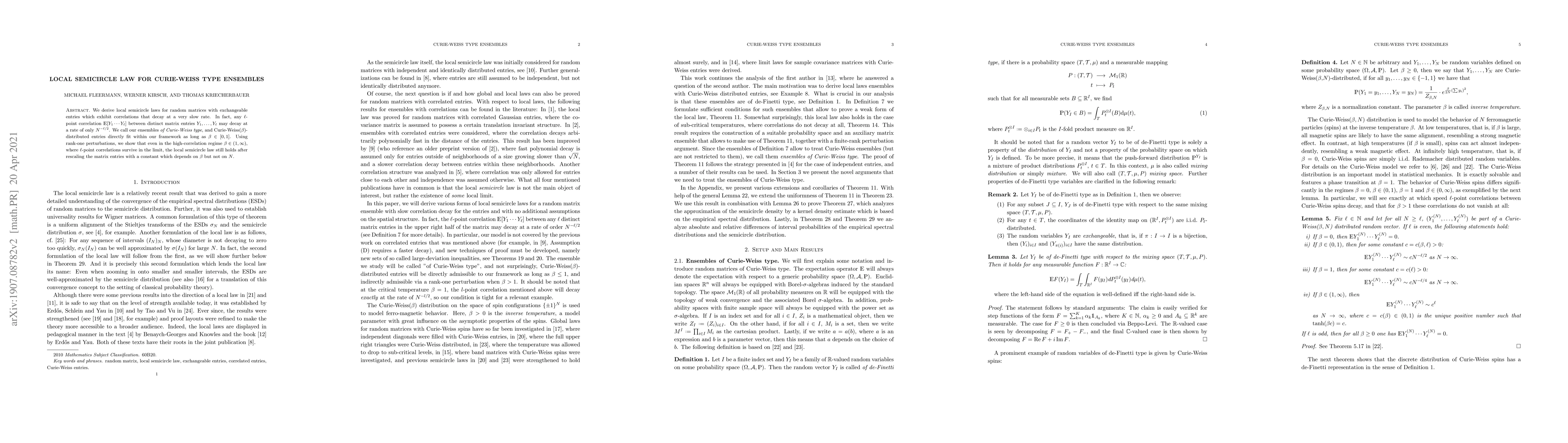 We derive and compare various forms of local semicircle laws for random matrices with exchangeable entries which exhibit correlations that decay at a very slow rate. In fact, any $l$-point correlation will decay at a rate of $N^{-l/2}$. We call our ensembles \emph{of Curie-Weiss type}, and Curie-Weiss($\beta$)-distributed entries are admissible as long as $\beta\leq 1$.