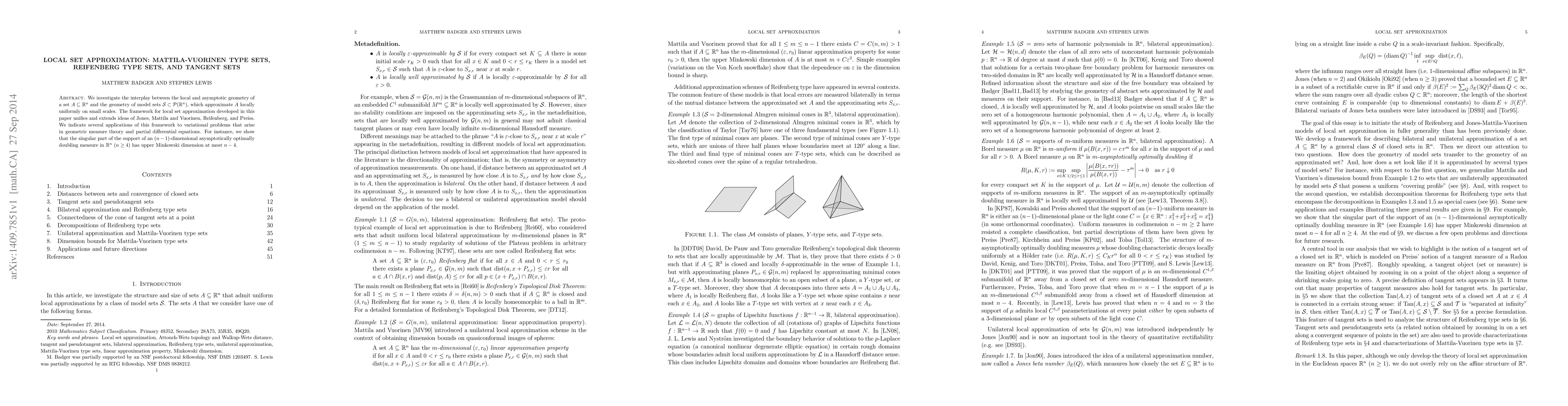 We investigate the interplay between the local and asymptotic geometry of a set $A \subseteq \mathbb{R}^n$ and the geometry of model sets $\mathcal{S} \subset \mathcal{P}(\mathbb{R}^n)$, which approximate $A$ locally uniformly on small scales. The framework for local set approximation developed in this paper unifies and extends ideas of Jones, Mattila and Vuorinen, Reifenberg, and Preiss. We indicate several applications of this framework to variational problems that arise in geometric measure theory and partial differential equations. For instance, we show that the singular part of the support of an $(n-1)$-dimensional asymptotically optimally doubling measure in $\mathbb{R}^n$ ($n\geq 4$) has upper Minkowski dimension at most $n-4$.