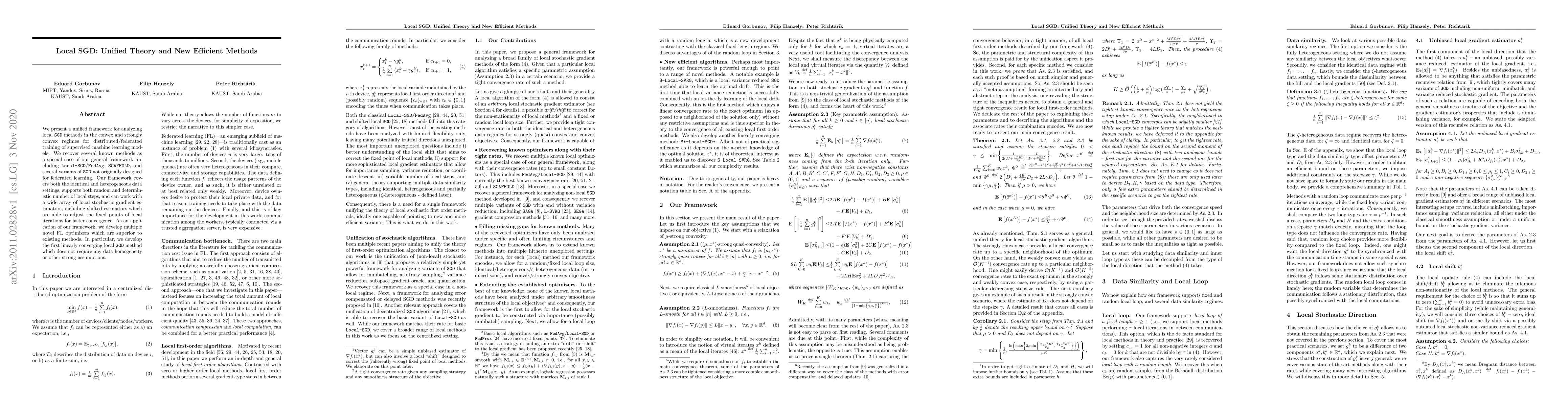 This paper presents a unified framework for analyzing local SGD methods in distributed/federated training, recovers known methods and develops novel FL optimizers that converge without data homogeneity assumptions.