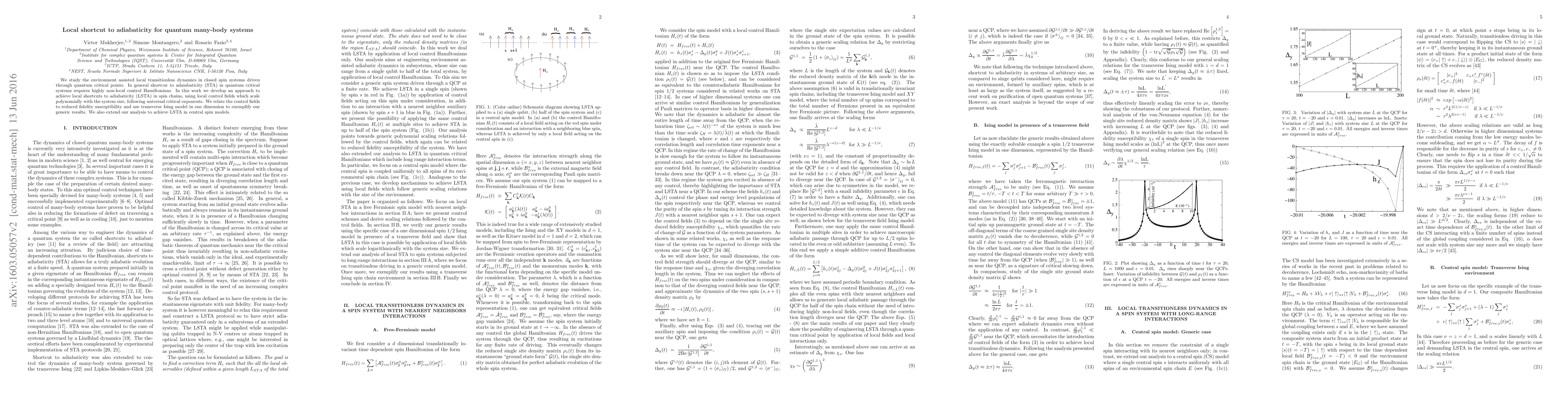 This paper develops a method for local shortcut to adiabaticity (LSTA) in quantum spin systems, enabling efficient transitions through quantum critical points using local control fields. The approach scales polynomially with system size and is demonstrated using the transverse Ising model and extended to central spin models.