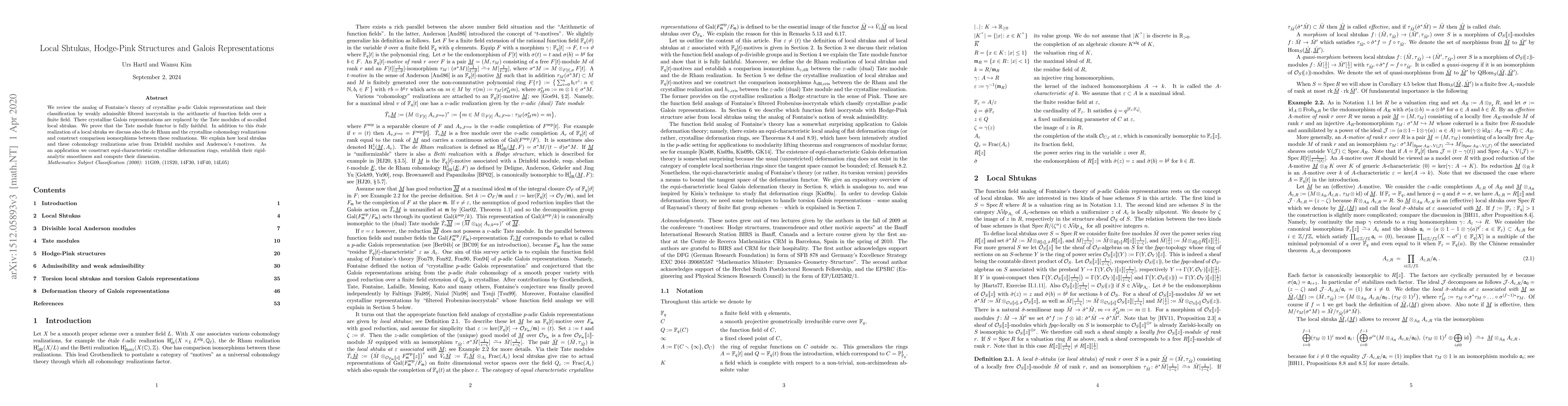 We review the analog of Fontaine's theory of crystalline $p$-adic Galois representations and their classification by weakly admissible filtered isocrystals in the arithmetic of function fields over a finite field. There crystalline Galois representations are replaced by the Tate modules of so-called local shtukas. We prove that the Tate module functor is fully faithful. In addition to this \'etale realization of a local shtuka we discuss also the de Rham and the crystalline cohomology realizations and construct comparison isomorphisms between these realizations. We explain how local shtukas and these cohomology realizations arise from Drinfeld modules and Anderson's $t$-motives. As an application we construct equi-characteristic crystalline deformation rings, establish their rigid-analytic smoothness and compute their dimension.