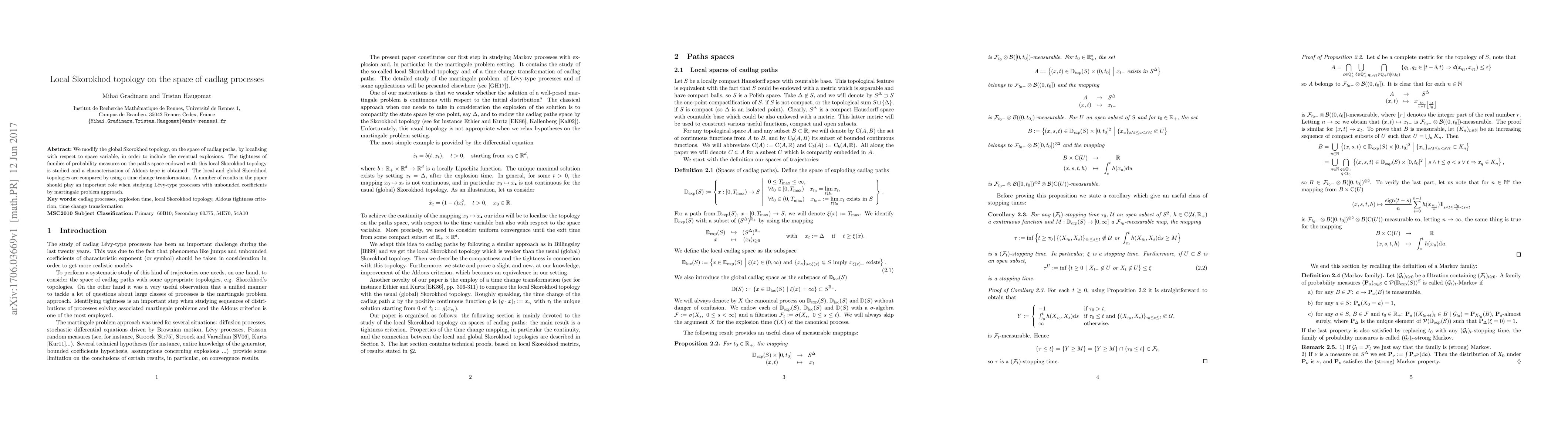 This paper introduces a local Skorokhod topology on the space of cadlag processes to accommodate eventual explosions, studies the tightness of measure families under this topology, and compares it to the global Skorokhod topology using time change transformations. The results are significant for studying Lévy-type processes with unbounded coefficients via the martingale problem approach.