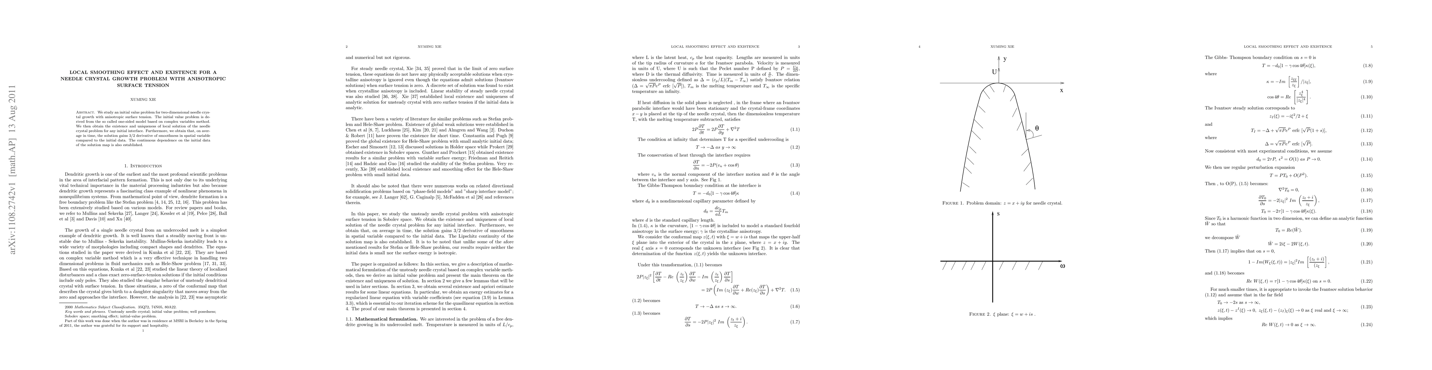 This paper investigates the initial value problem for two-dimensional needle crystal growth with anisotropic surface tension, proving the existence and uniqueness of local solutions. It also demonstrates local smoothing, showing that the solution gains 3/2 derivative of smoothness on average over time compared to the initial data.