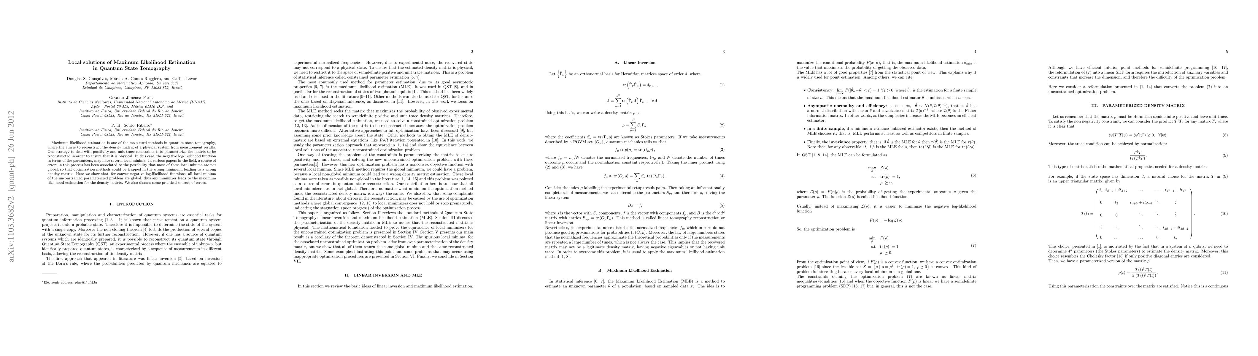 Maximum likelihood estimation is one of the most used methods in quantum state tomography, where the aim is to reconstruct the density matrix of a physical system from measurement results. One strategy to deal with positivity and unit trace constraints is to parameterize the matrix to be reconstructed in order to ensure that it is physical. In this case, the negative log-likelihood function in terms of the parameters, may have several local minima. In various papers in the field, a source of errors in this process has been associated to the possibility that most of these local minima are not global, so that optimization methods could be trapped in the wrong minimum, leading to a wrong density matrix. Here we show that, for convex negative log-likelihood functions, all local minima of the unconstrained parameterized problem are global, thus any minimizer leads to the maximum likelihood estimation for the density matrix. We also discuss some practical sources of errors.
