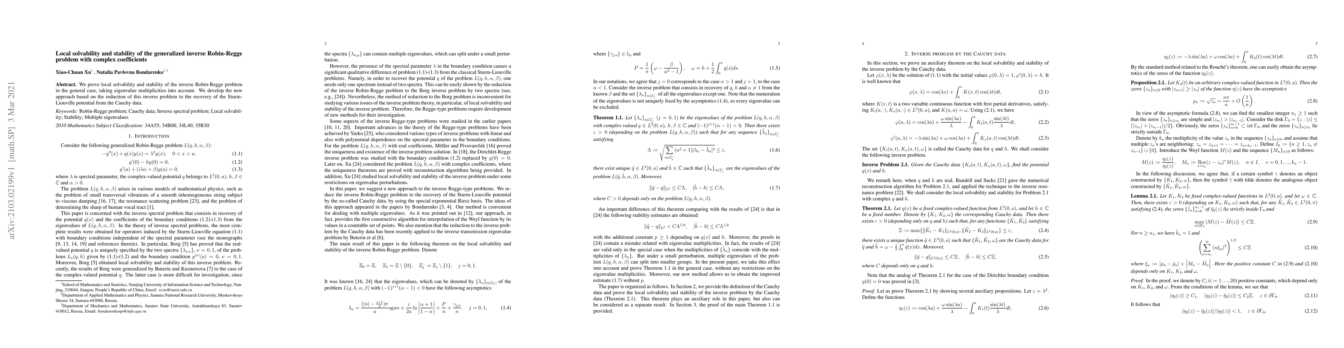 This paper proves local solvability and stability of the inverse Robin-Regge problem for complex coefficients, leveraging a new approach to reduce it to recovering the Sturm-Liouville potential from Cauchy data.