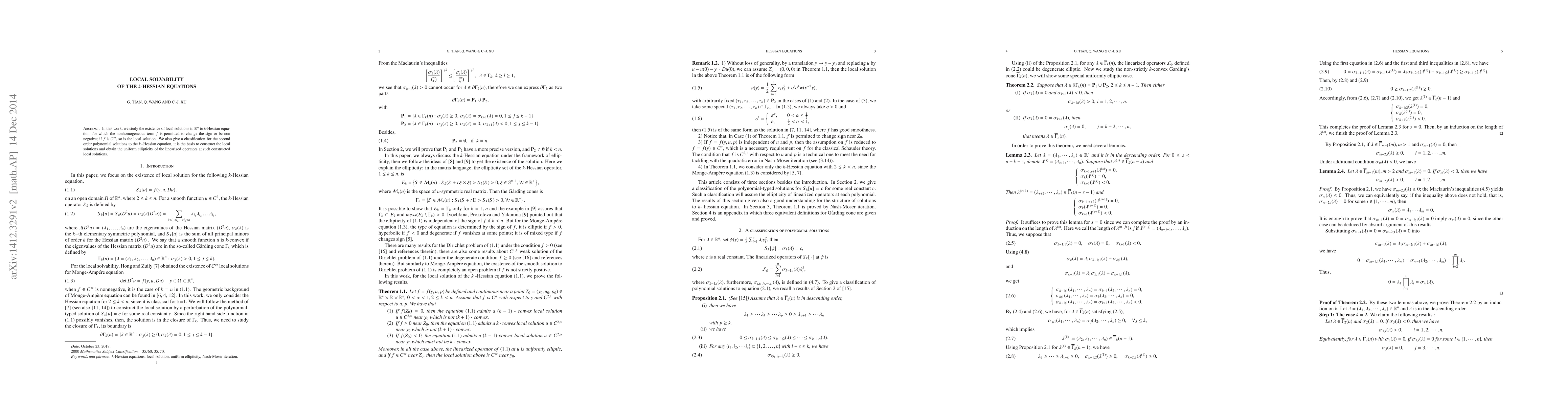 Researchers study local solvability of $k$-Hessian equations with nonhomogeneous terms that can change sign or be non-negative. They also classify second-order polynomial solutions to the equation, providing a basis for constructing local solutions.
