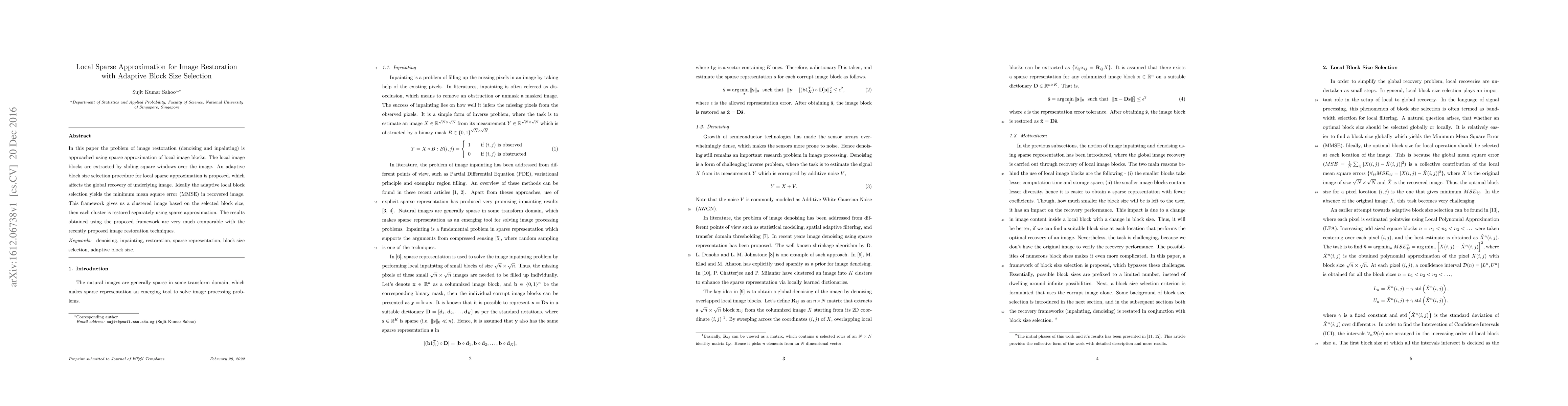 This paper proposes an adaptive block size selection method for local sparse approximation to restore images by denoising and inpainting. The method extracts local image blocks and restores each cluster separately, achieving results comparable to recent techniques while minimizing mean square error.