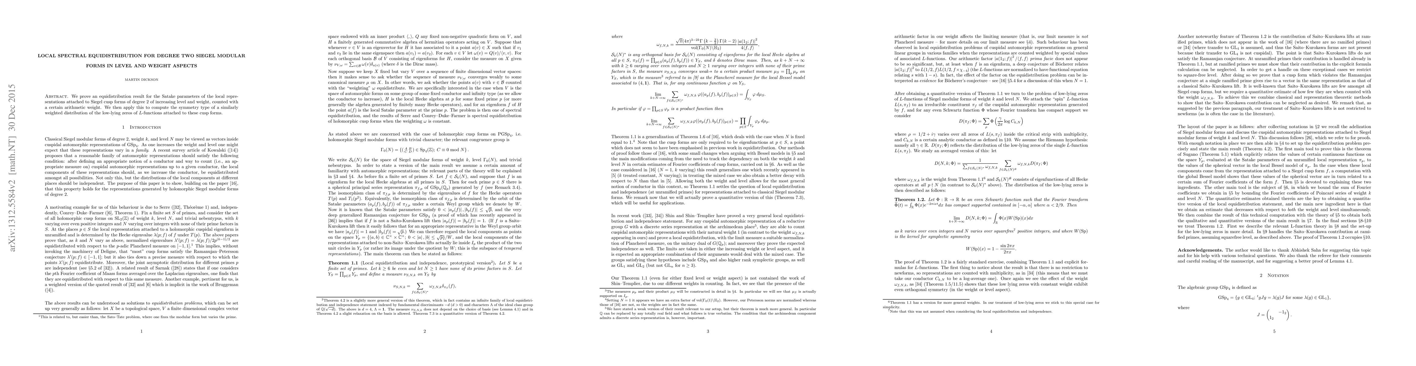 This paper proves equidistribution for the Satake parameters of local representations associated with degree 2 Siegel modular forms, advancing understanding in level and weight aspects. It further applies this result to determine the symmetry type of the low-lying zeros of $L$-functions linked to these forms.