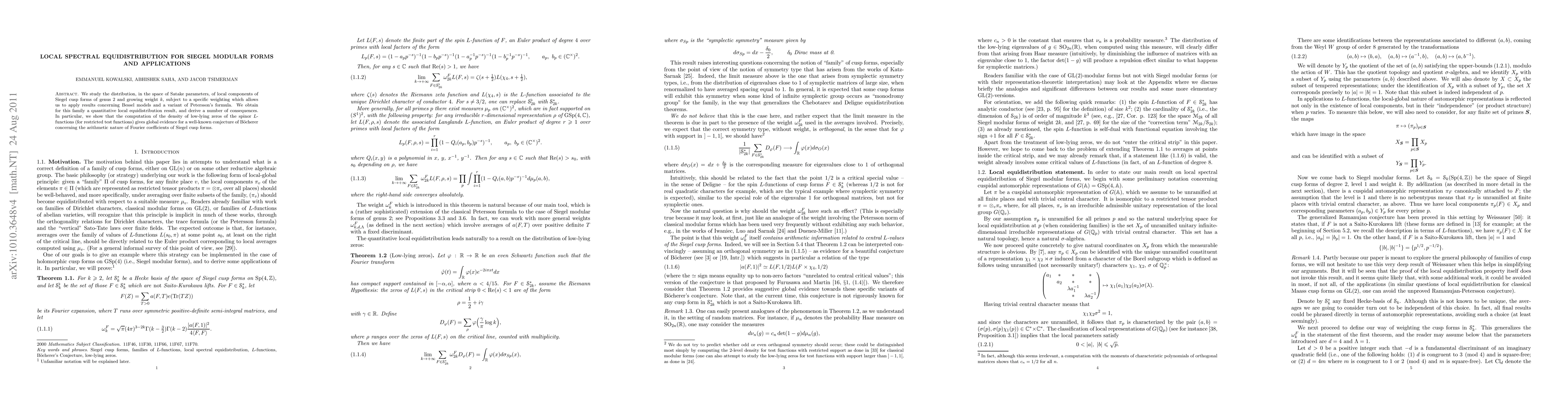 This paper investigates the local spectral equidistribution of Siegel cusp forms of genus 2 and increasing weight, proving a quantitative equidistribution result. It also provides evidence supporting B\"ocherer's conjecture on the arithmetic nature of Fourier coefficients through the density of low-lying zeros of spinor L-functions.