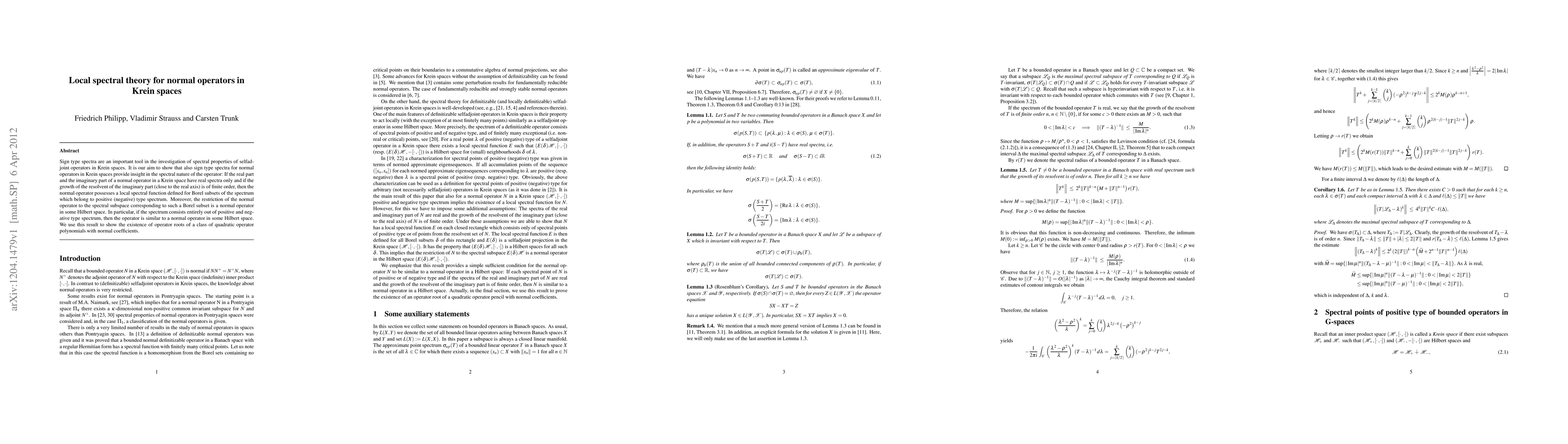This paper explores local spectral theory for normal operators in Krein spaces, demonstrating that sign type spectra provide insight into the spectral nature of these operators. It concludes that under certain conditions, normal operators possess a local spectral function and are similar to normal operators in Hilbert spaces, facilitating the existence of operator roots for specific quadratic operator polynomials.