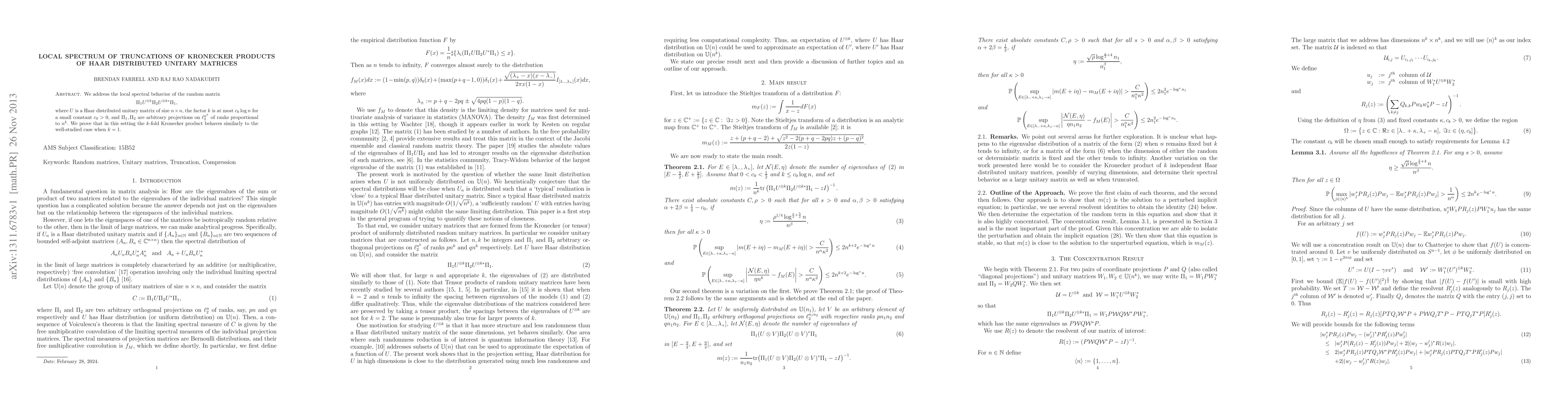 We address the local spectral behavior of the random matrix $\Pi_1 U^{\otimes k} \Pi_2 U^{\otimes k *} \Pi_1$, where $U$ is a Haar distributed unitary matrix of size $n\times n$, the factor $k$ is at most $c_0\log n$ for a small constant $c_0>0$, and $\Pi_1,\Pi_2$ are arbitrary projections on $\ell_2^{n^k}$ of ranks proportional to $n^k$. We prove that in this setting the $k$-fold Kronecker product behaves similarly to the well-studied case when $k=1$.