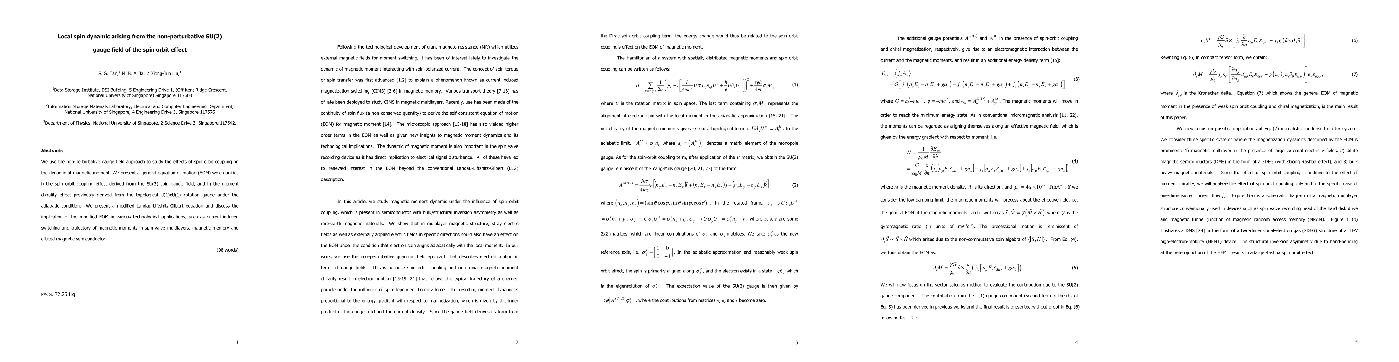 We use the non-perturbative gauge field approach to study the effects of spin orbit coupling on the dynamic of magnetic moment. We present a general equation of motion (EOM) which unifies i) the spin orbit coupling effect derived from the SU(2) spin gauge field, and ii) the moment chirality effect previously derived from the topological U(1)xU(1) rotation gauge under the adiabatic condition. We present a modified Landau-Liftshitz-Gilbert equation and discuss the implication of the modified EOM in various technological applications, such as current-induced switching and trajectory of magnetic moments in spin-valve multilayers, magnetic memory and diluted magnetic semiconductor.